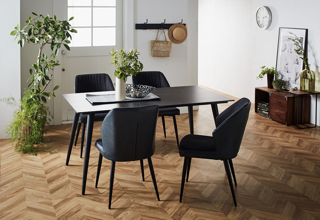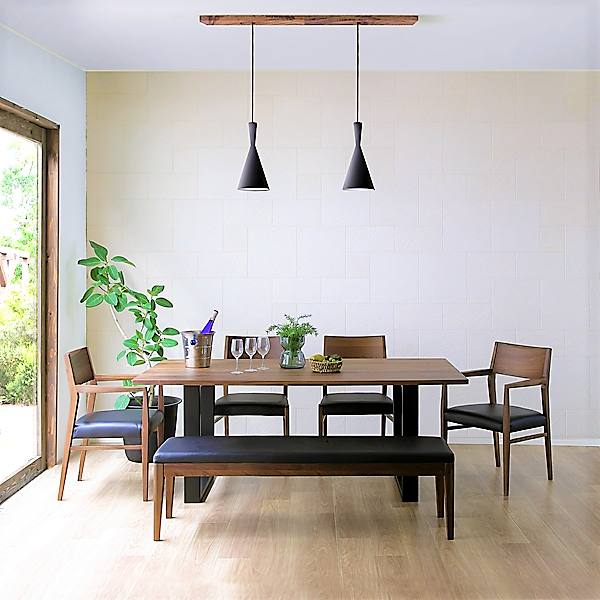 最高級ブラックウォールナットを使用したベーシックな無垢テーブルと、カバーリングチェアの組み合わせ。