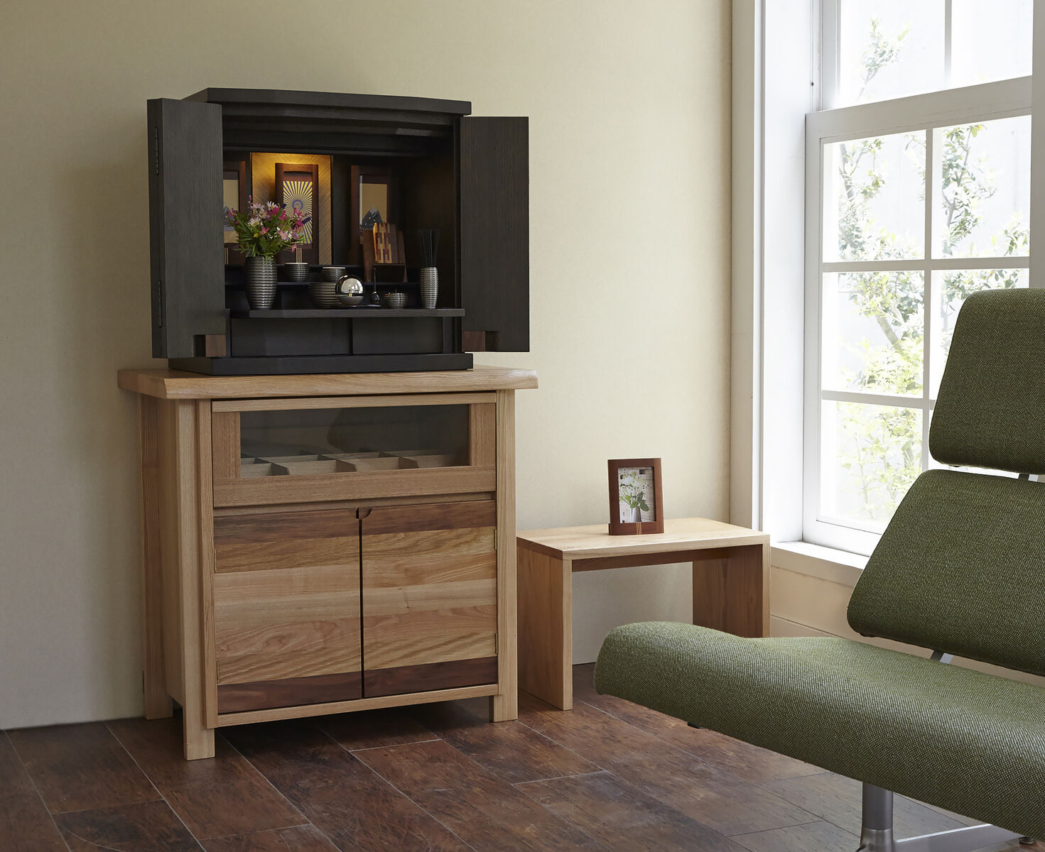 ワイドタイプでゆったり仏具をお祀りできます。「下台と仏具は別売」