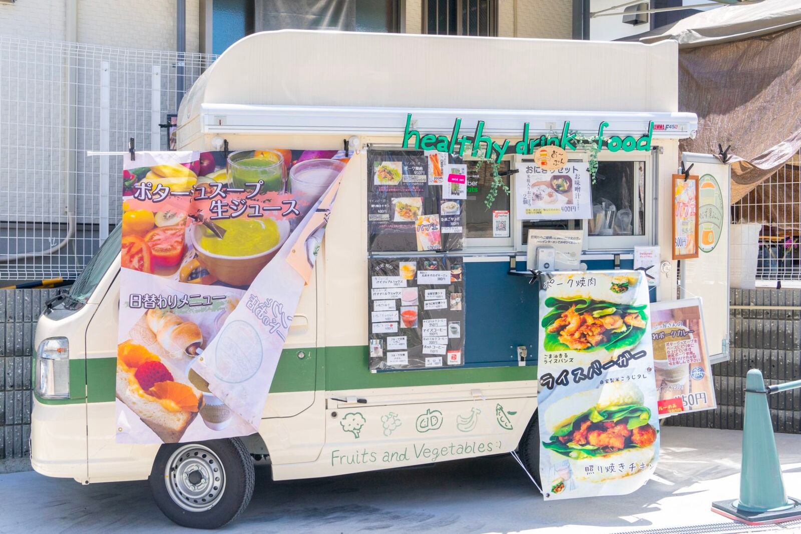 枚方公園駅商店街から河川敷に向かう場所で米こうじ、野菜、果物が中心のヘルシーメニューを販売しているキッチンカー。