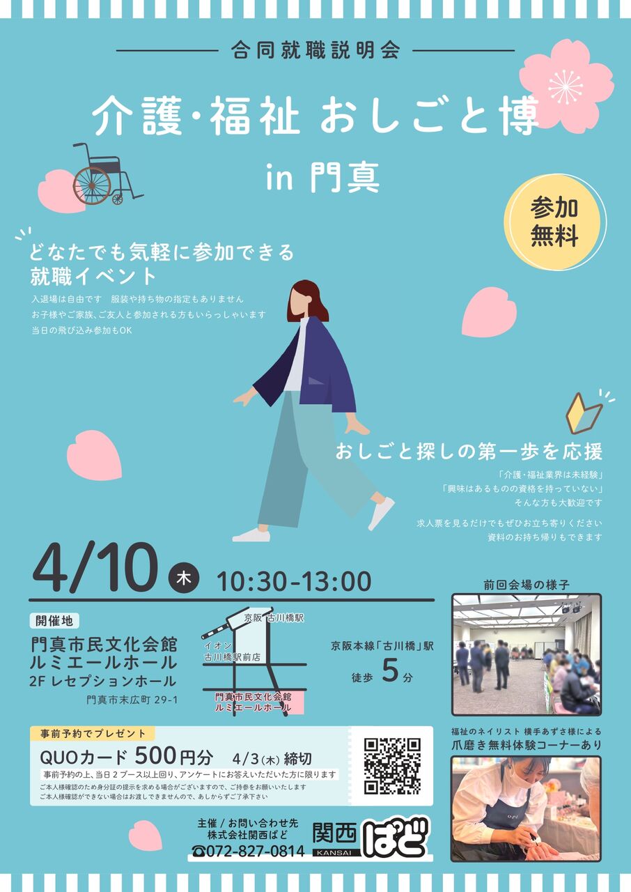 4月10日(木)の10:30~13:00に「門真市民会館ルミエールホール2F レセプションホール」で介護・福祉業界に特化した合同就職説明会『介護・福祉 おしごと博in門真』が開催されるとのこと。