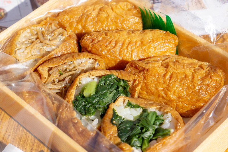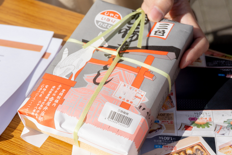 こちらは老舗 壺屋弁当部さんの『三色稲荷』でして、甘いタレでじっくり煮込んだ油揚げで『わさび・ちりめん山椒・定番の稲荷ずし』の3種類が楽しめるセットを限定数ご用意いただきます」