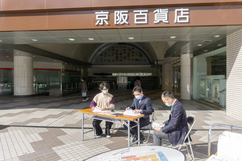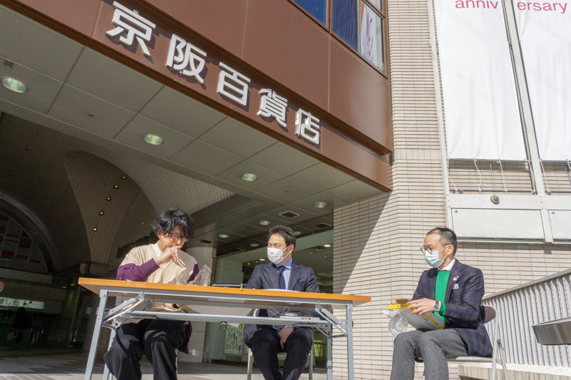 左からビーバー(もりつースタッフ)と、催事を企画運営されている京阪百貨店バイヤーの風呂谷さん・宣伝部の高岡さん。