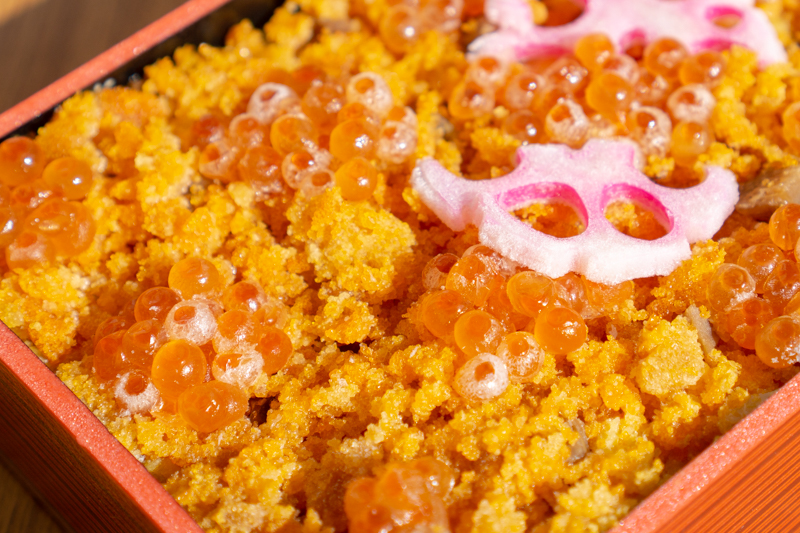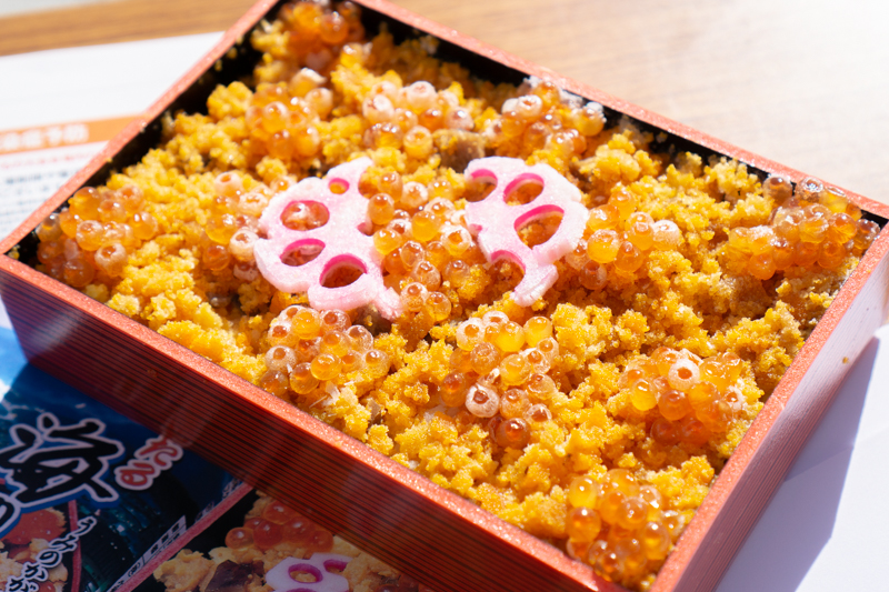 「お花畑をイメージして、うに・いくら・そして酢飯の上に一面に散りばめられたししゃもの卵。100年以上続く看板駅弁です。