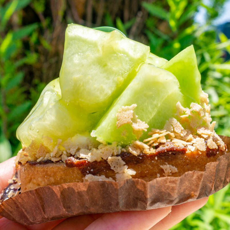 メロンは爽やかな甘さで、果肉はシャキッとしっかりめ。ゼリーが喉越しさわやかで、カスタードクリームの甘さがやさしい〜。
