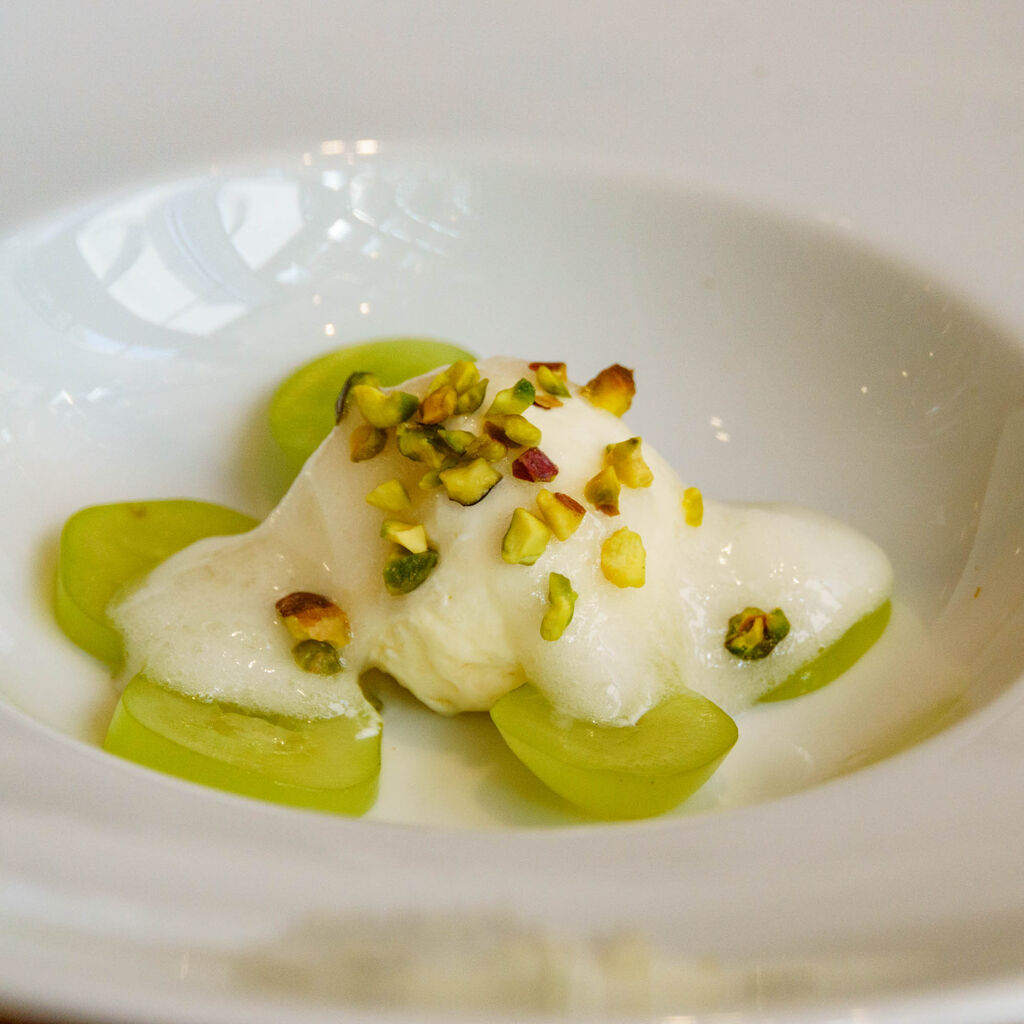 シャインマスカットとさっぱりしたシャーベットみたいな組み合わせ。最初の1皿からめっちゃクオリティ高い!