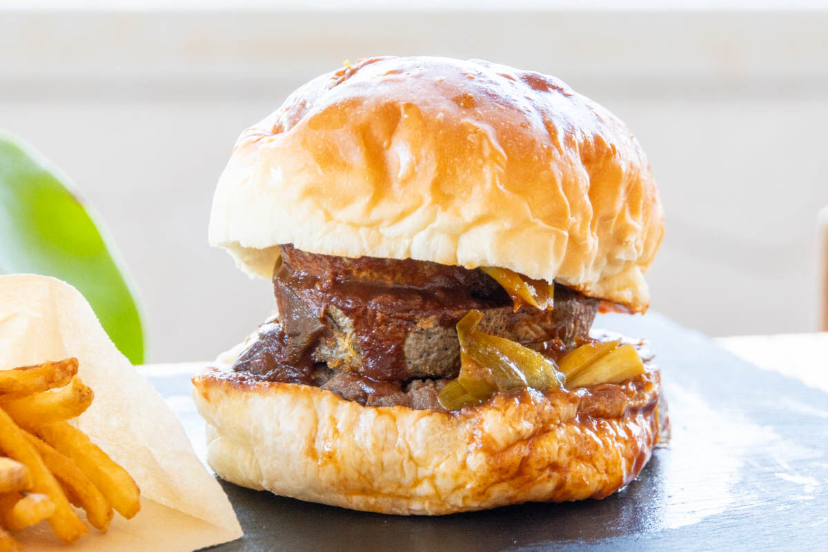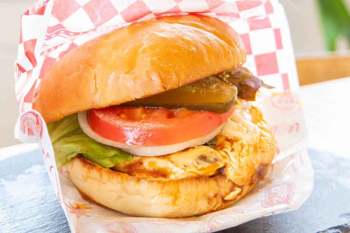 「お肉がふわふわのハンバーグみたいでたべやすい!甘めのソースが美味しい。南国風な感じもするけど、優しい家庭の味感もあって親しみやすいバーガー!」