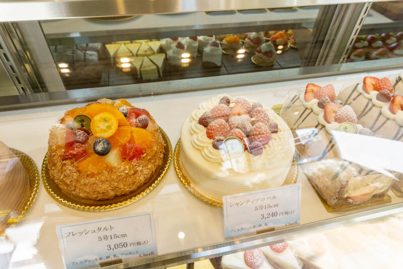撮っているときには気づかなくてお店の方にもお伝えできず申し訳ないのですが、画像右上のケーキのプライスカードは「フレッシュいちご」と『フレッシュきんかん』が逆かも。