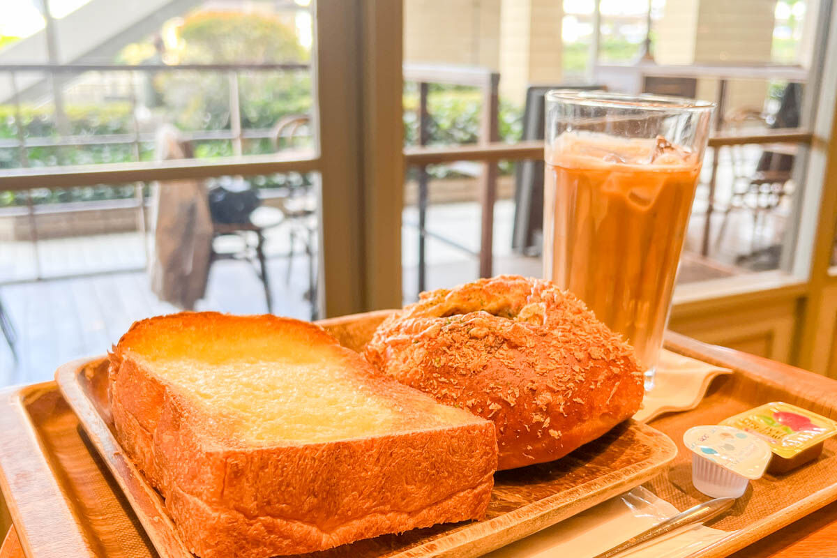 こちらは同行したゆうぽんが食べた「幸せのトーストセット(500円)」と「新・黒カレーパン(340円)」。分厚くカットされたトーストにザクッと本格的な辛さのカレーパンだったそうですよ〜!