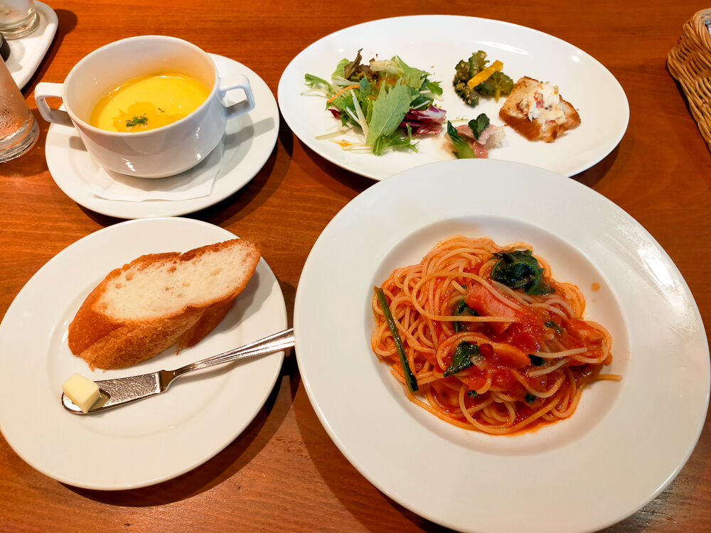 「パスタランチA」の注文後に店外の撮影をして店内に戻ったら、テーブルに前菜とスープが置かれていました。