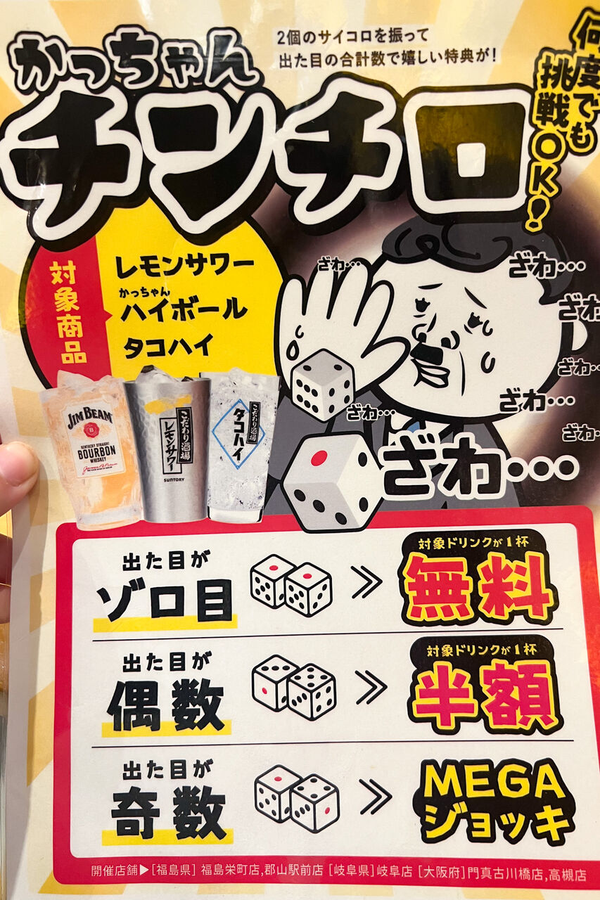 先述のレモンサワーとタコハイ、翠ジンがもっとお得に飲める「チンチロ」。