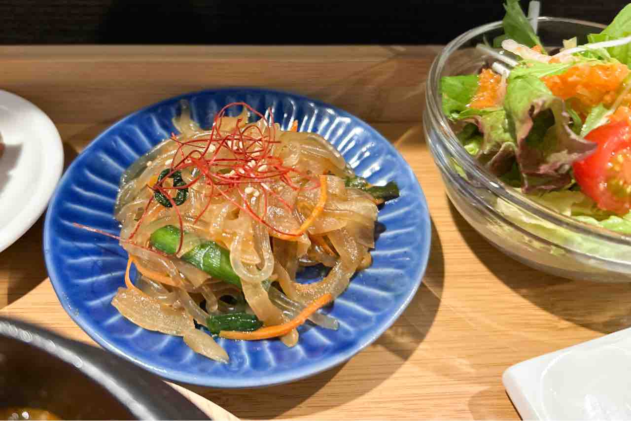 チャプチェと野菜サラダ。少し甘い味付けのチャプチェは麺がもっちり!