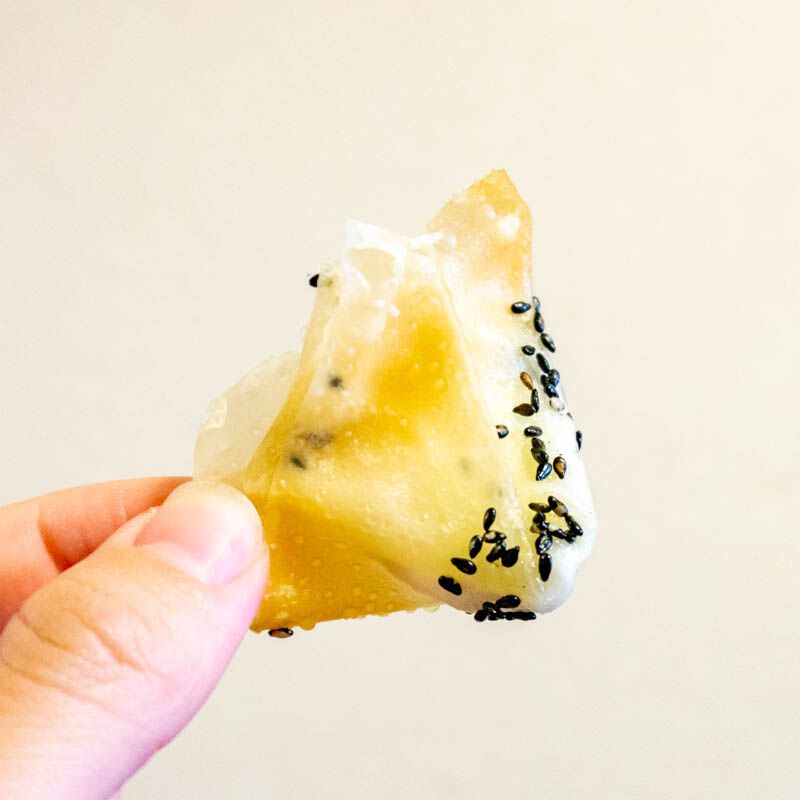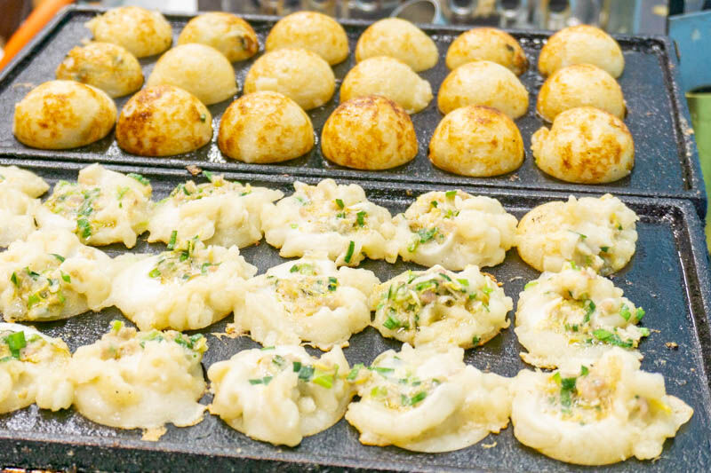 奥はたこ焼きに見えて、手前は餃子をつつんでいて、なんとも不思議な様子。