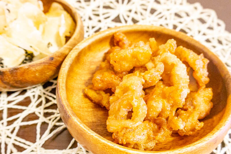 鶏皮の唐揚げも衣がサクサクでしたが、皮がモチモチと弾力があって食べごたえある一品。