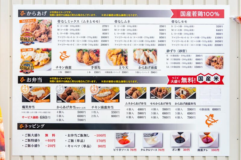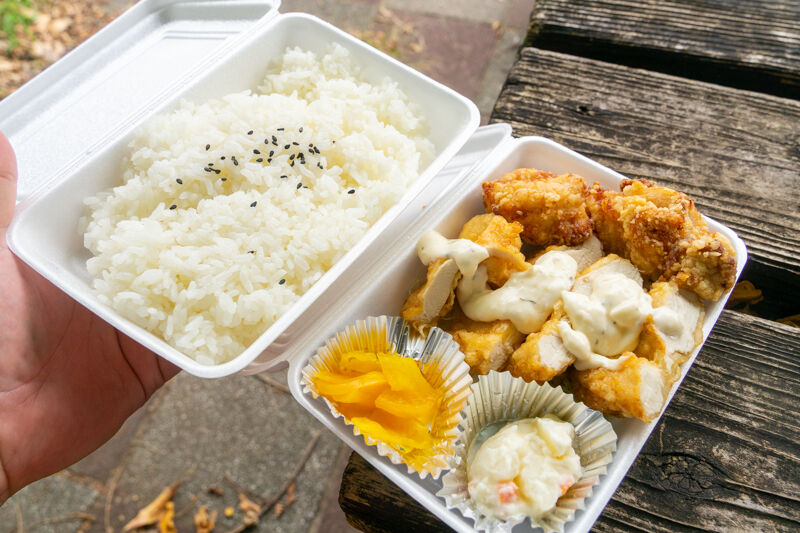 唐揚げ単品で注文しようかと思ったんですが、お店の名前を冠している商品に間違いないはず!と思い鶏笑弁当を注文。ご飯大盛りは無料っていうんで、もちろん大盛りにしました。