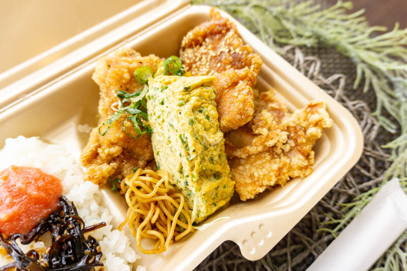ご飯や副菜をセットしたお弁当箱を渡されて、店頭で好きなから揚げや出汁巻きを自分で選んでお弁当箱にセットするというスタイルでした。