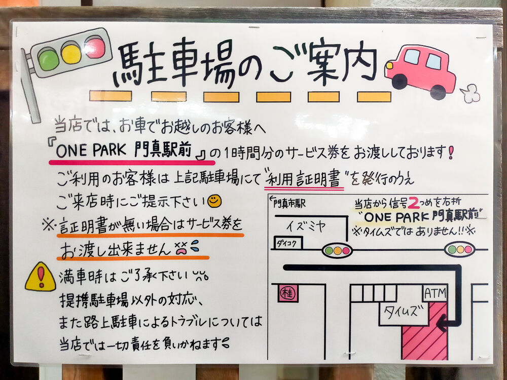 駅前のお店ですが、「ONE PARK 門真駅前」の1時間分のサービス券がもらえるみたい。