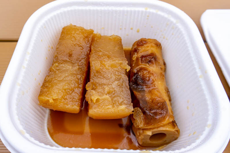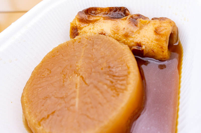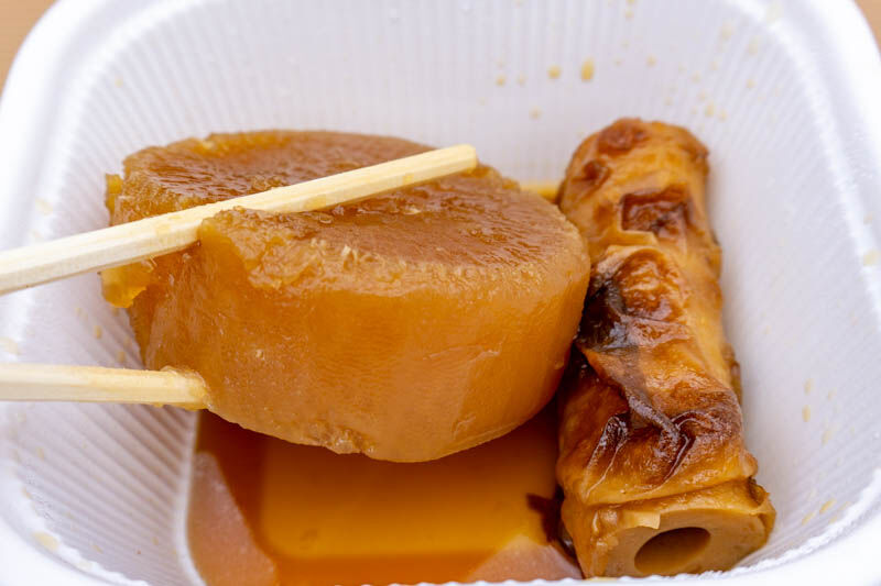 まずこちらのおでん【大根・ちくわ】(各100円)。