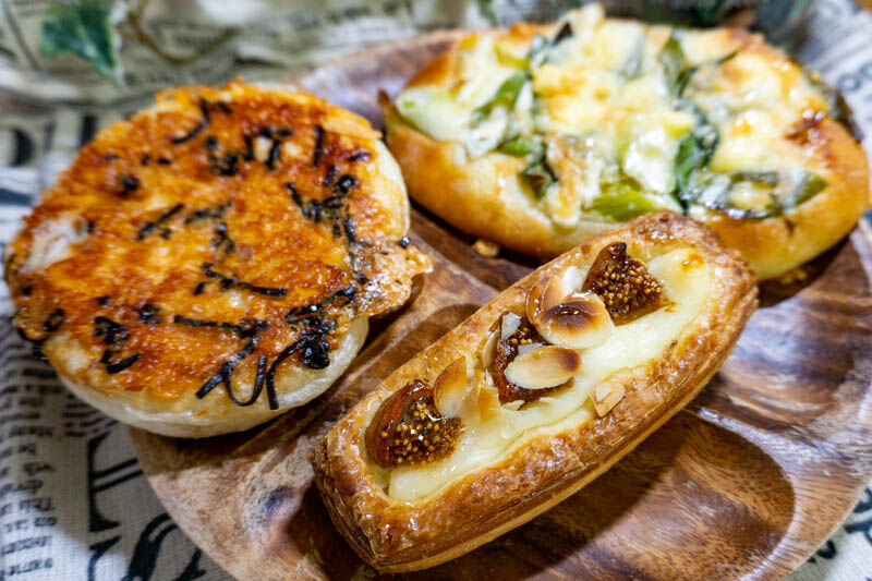 左から時計まわりに、パリパリチーズの塩こんぶパン(150円税抜)、九条ネギとチーズのピザパン(190円税抜)、いちじくのデニッシュ(150円税抜)です。