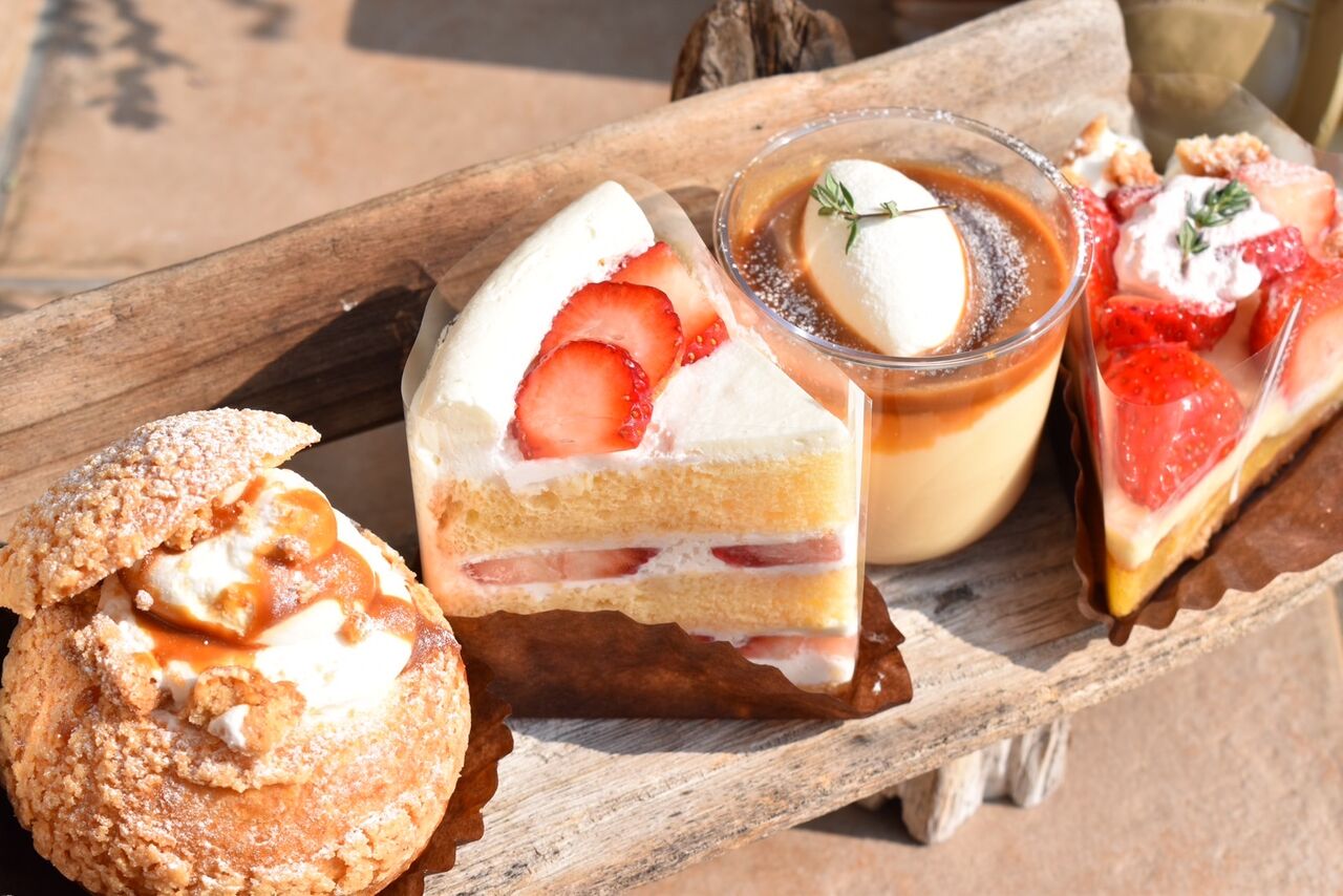 「苺タルト(600円)、苺のショートケーキ(580円)、プリン(400円)、キャラメルソース入りクッキーシュー(290円)」です!