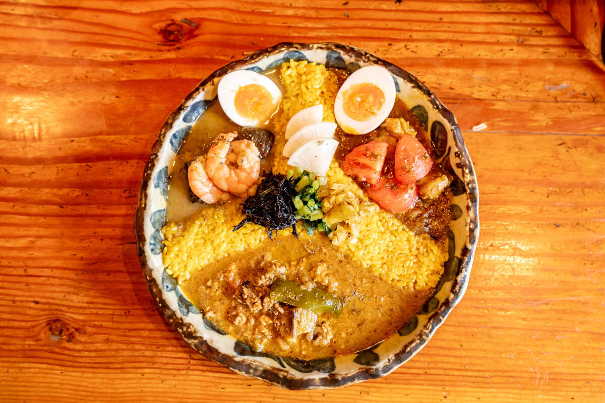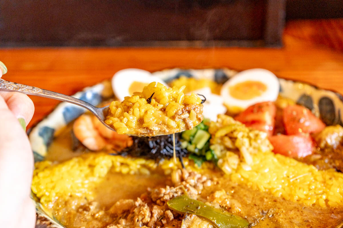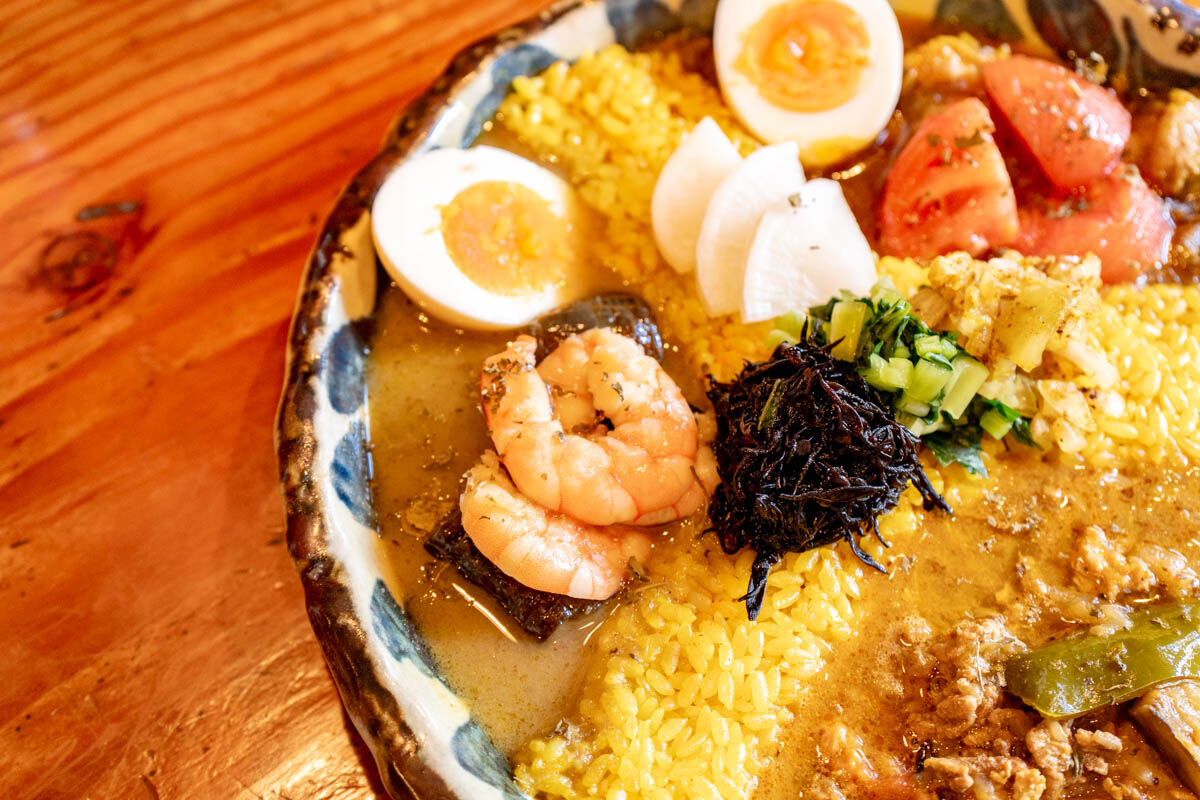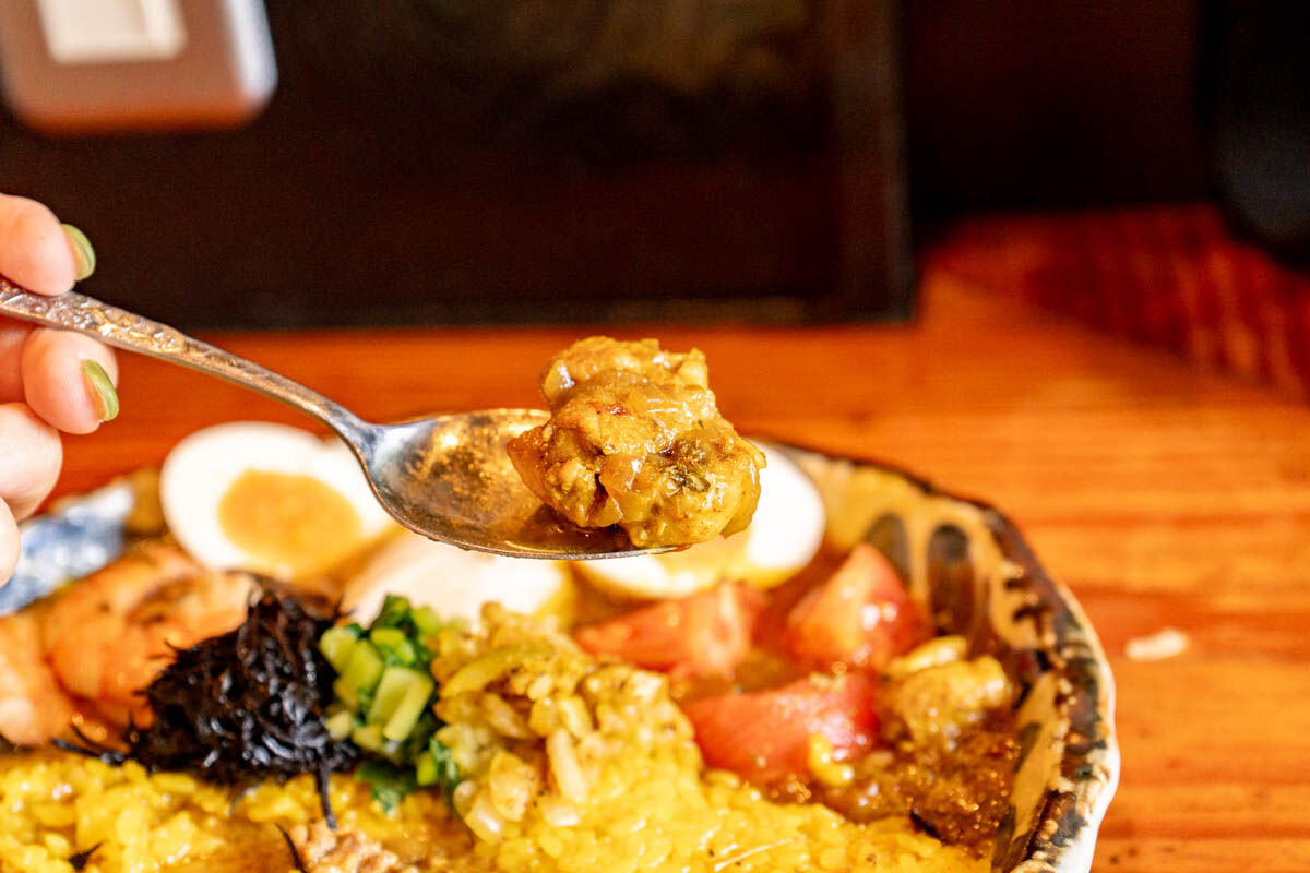 こちらはルーの中にたくさんひき肉が入っていました。少しこってりとしたルー。ピリ辛の中に感じるしっかりしたお出汁。ターメリックライスとめっちゃ合います。