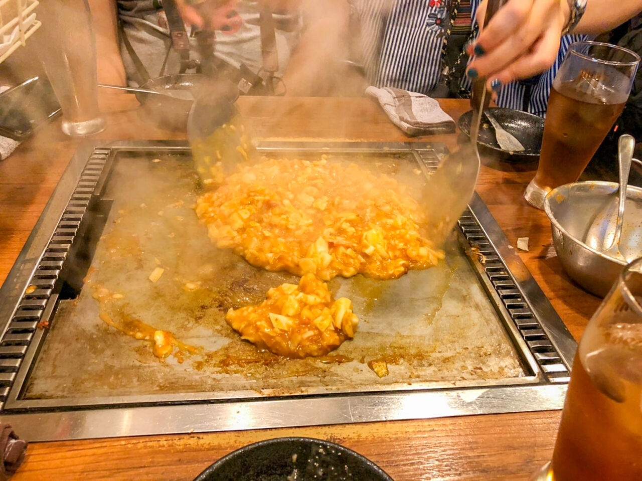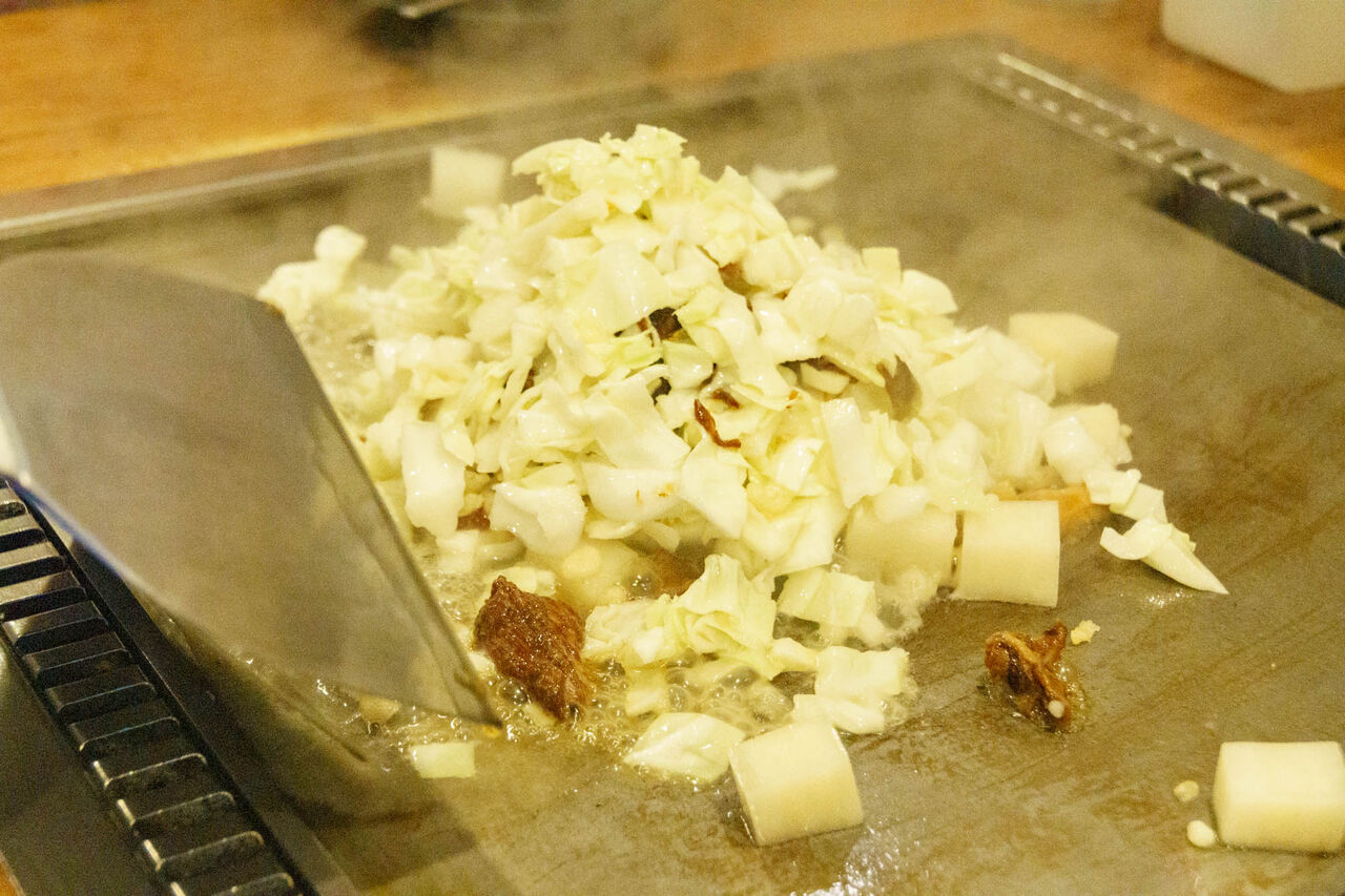 最初の1回だけ店員さんが焼いてくれまして、2回目からはそれを真似して自分で焼くスタイルです。もんじゃ初心者の我々にとってはうれしいシステム!