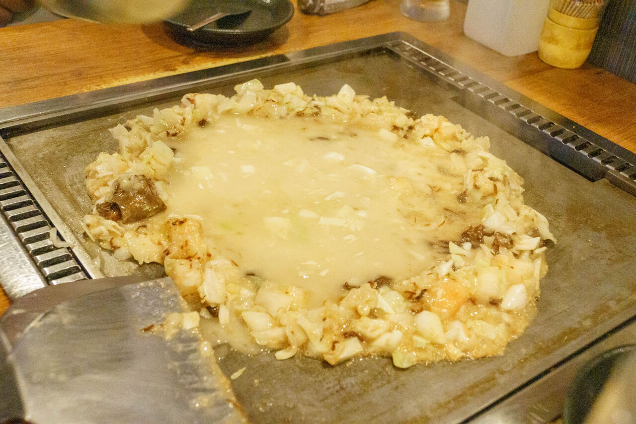円形にひろげ真ん中に、出汁を流し込んでいきます。この土手をつくるっていうのがもんじゃの醍醐味ですよね!(知ったかぶり)