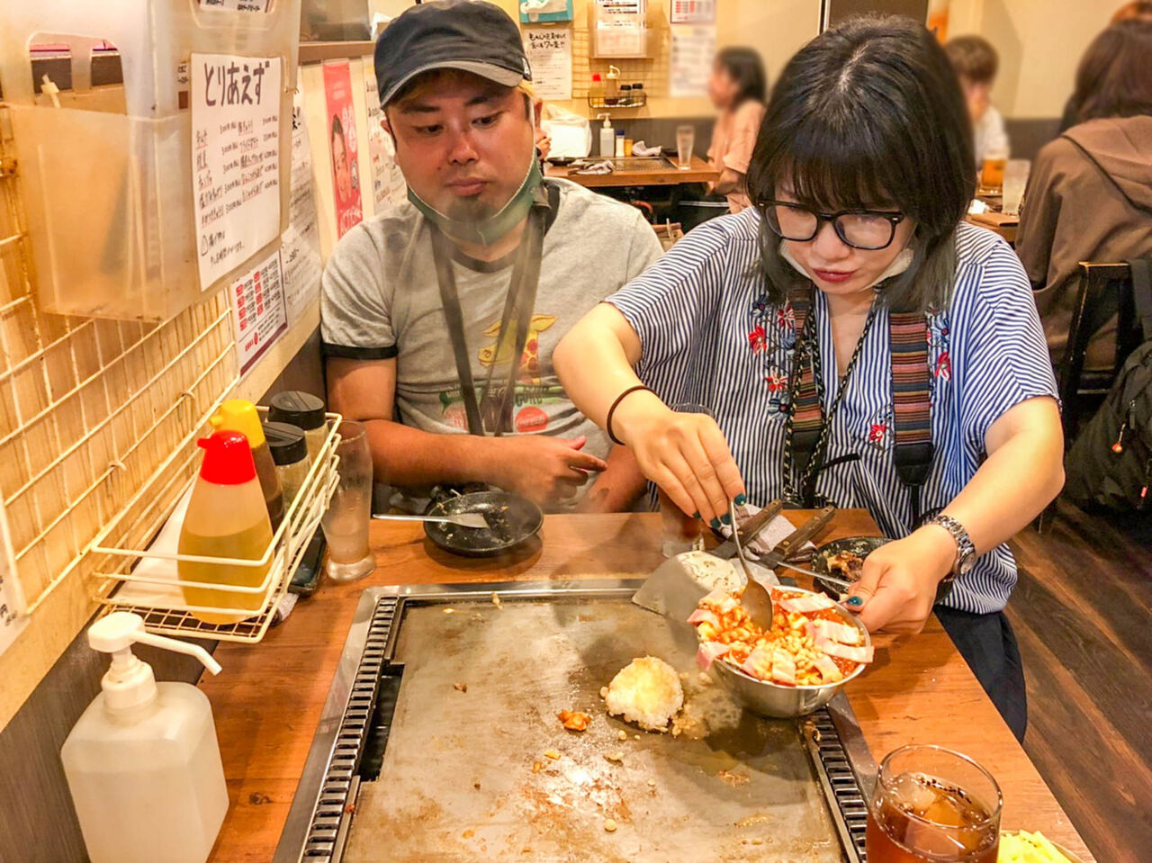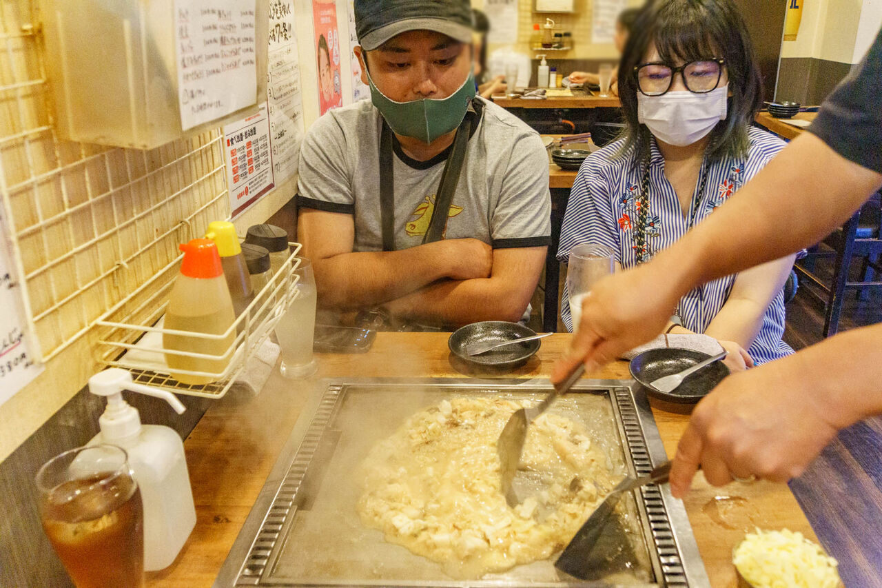 (もんじゃを見つめている、すどんとゆうぽん)