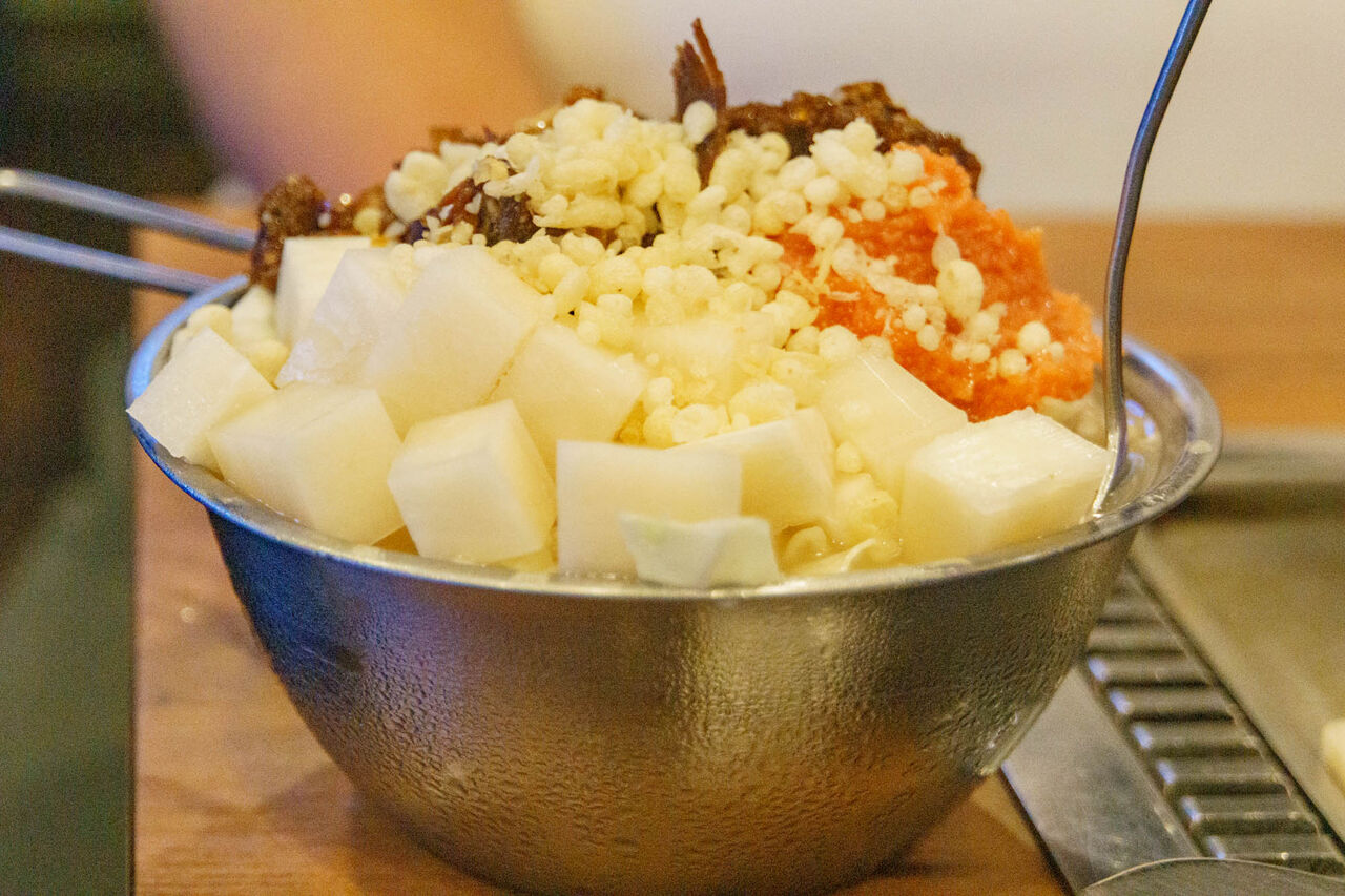 焼けたら、ちいさなコテを使い鉄板からこそげ落とすようにすくって食べます。おこげが一番美味しい部分なんだそう!