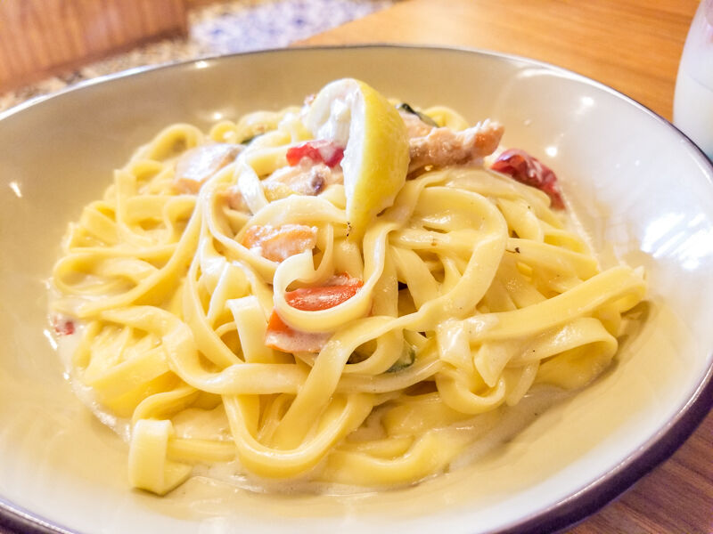 これは奥さんが注文した「スモークサーモンと彩り野菜のレモンクリームソース(1208円)」。