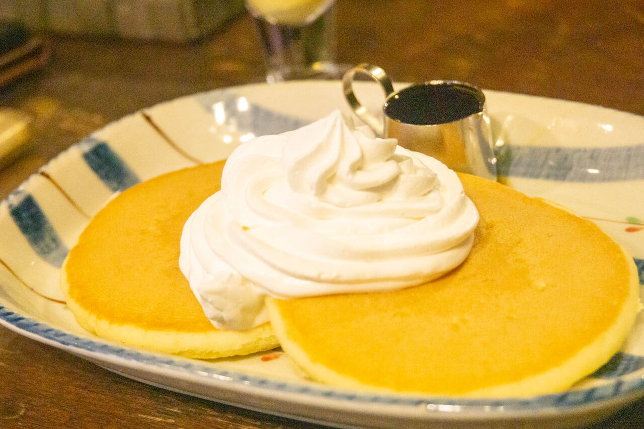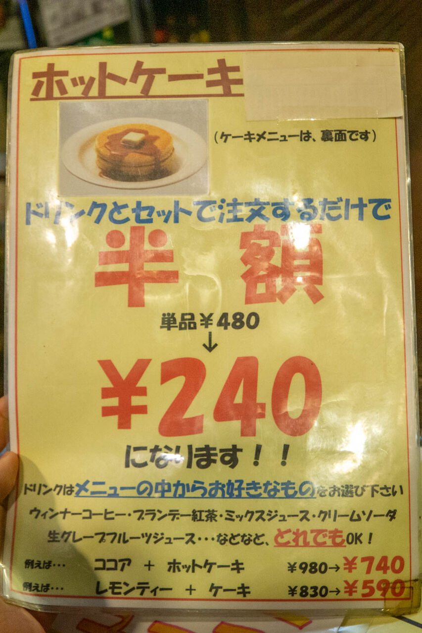 ホットケーキはドリンクと一緒に頼むと半額に。