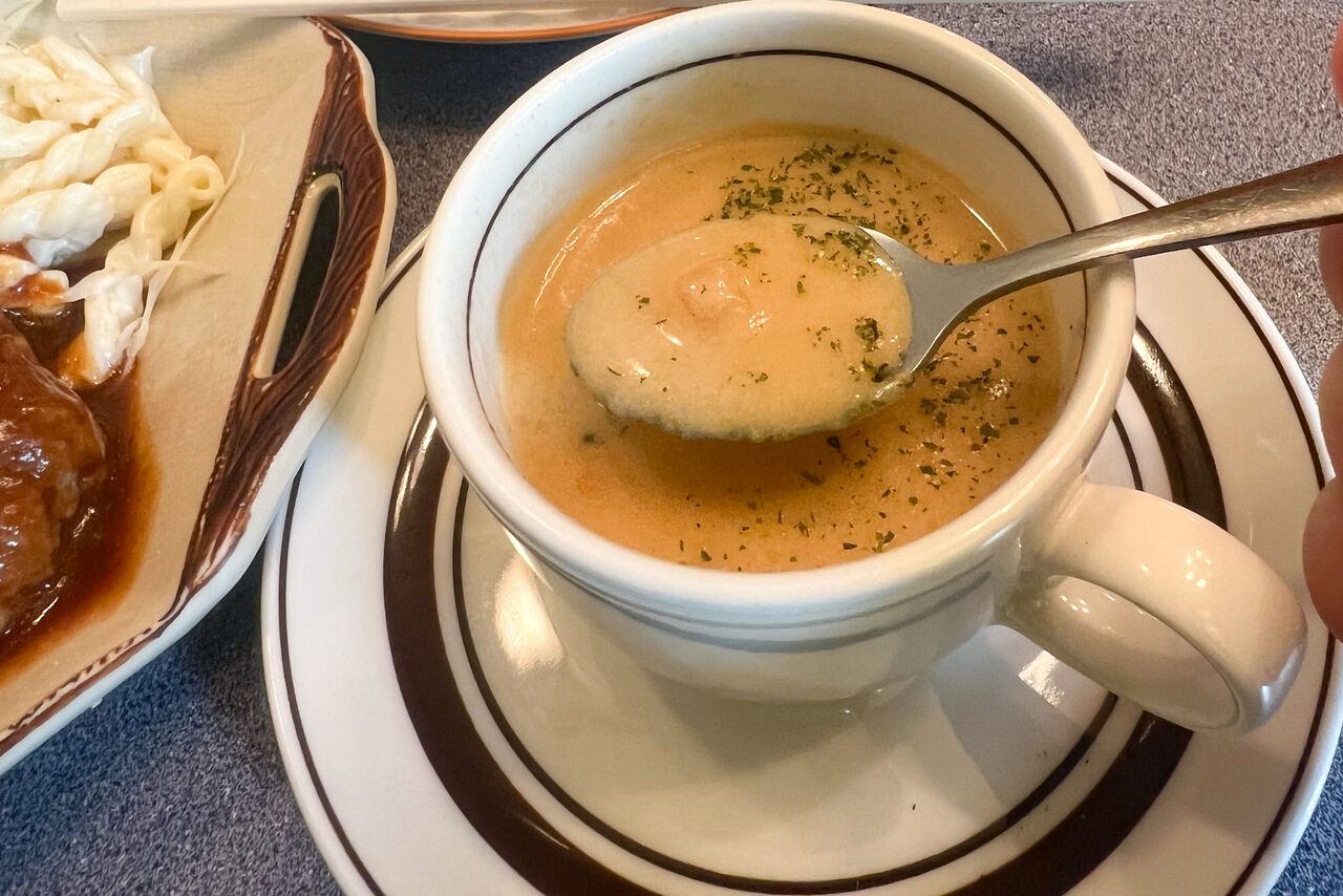 このまろやかなスープ。玉ねぎとコーン、じゃがいもの自然な甘さとコクについうっとりしてしまいます。