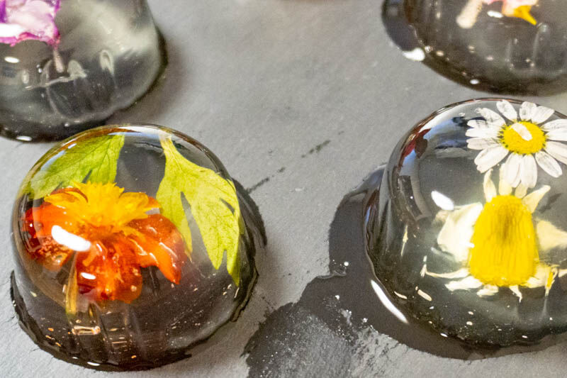 食べられるお花「エディブルフラワー」を寒天製の錦玉菓子に閉じ込めているとの事。