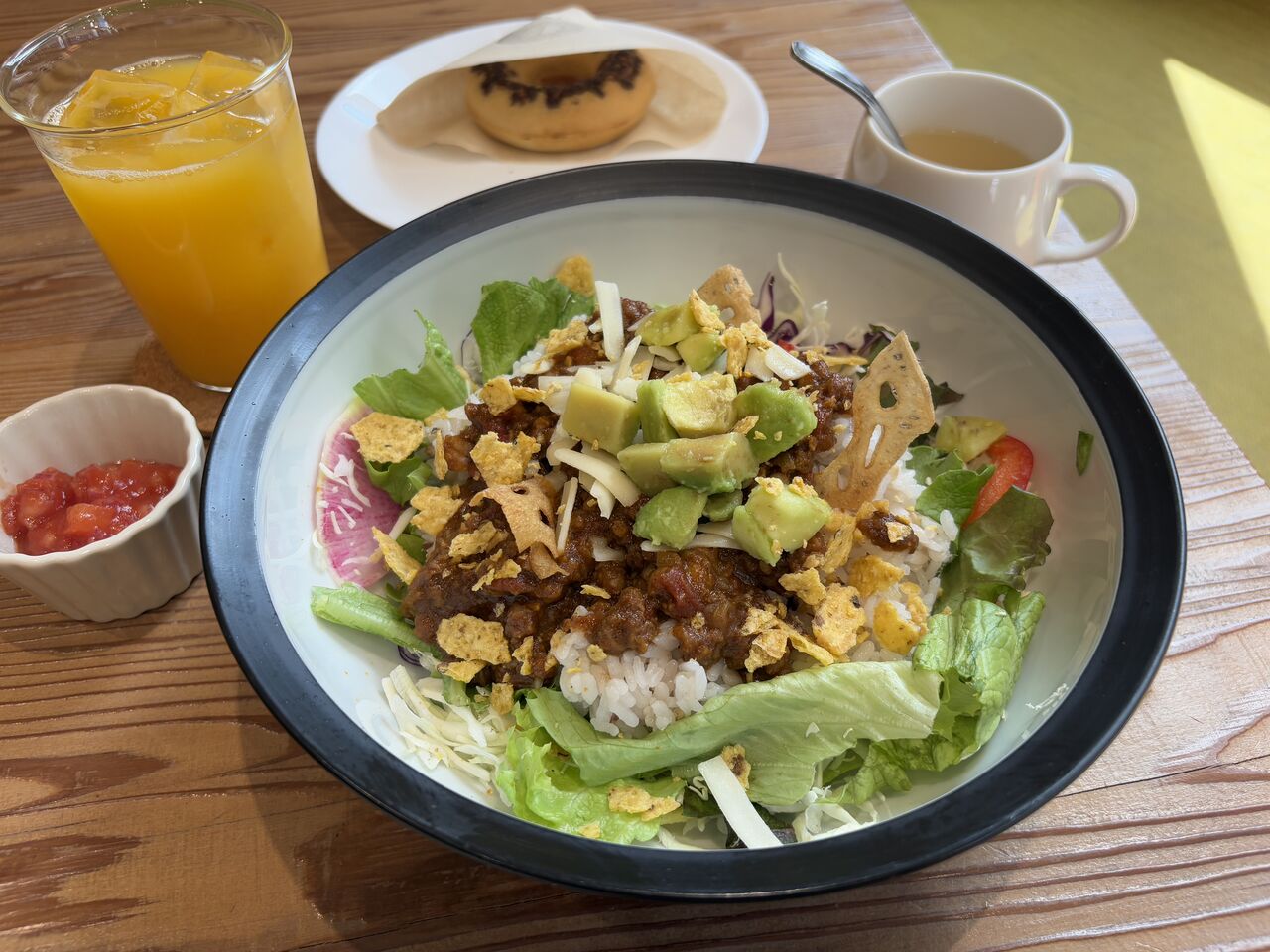 「れんこんチップのタコライス ドリンクセット(1300円)、TSUMIKIドーナツチョコ(250円)」です!