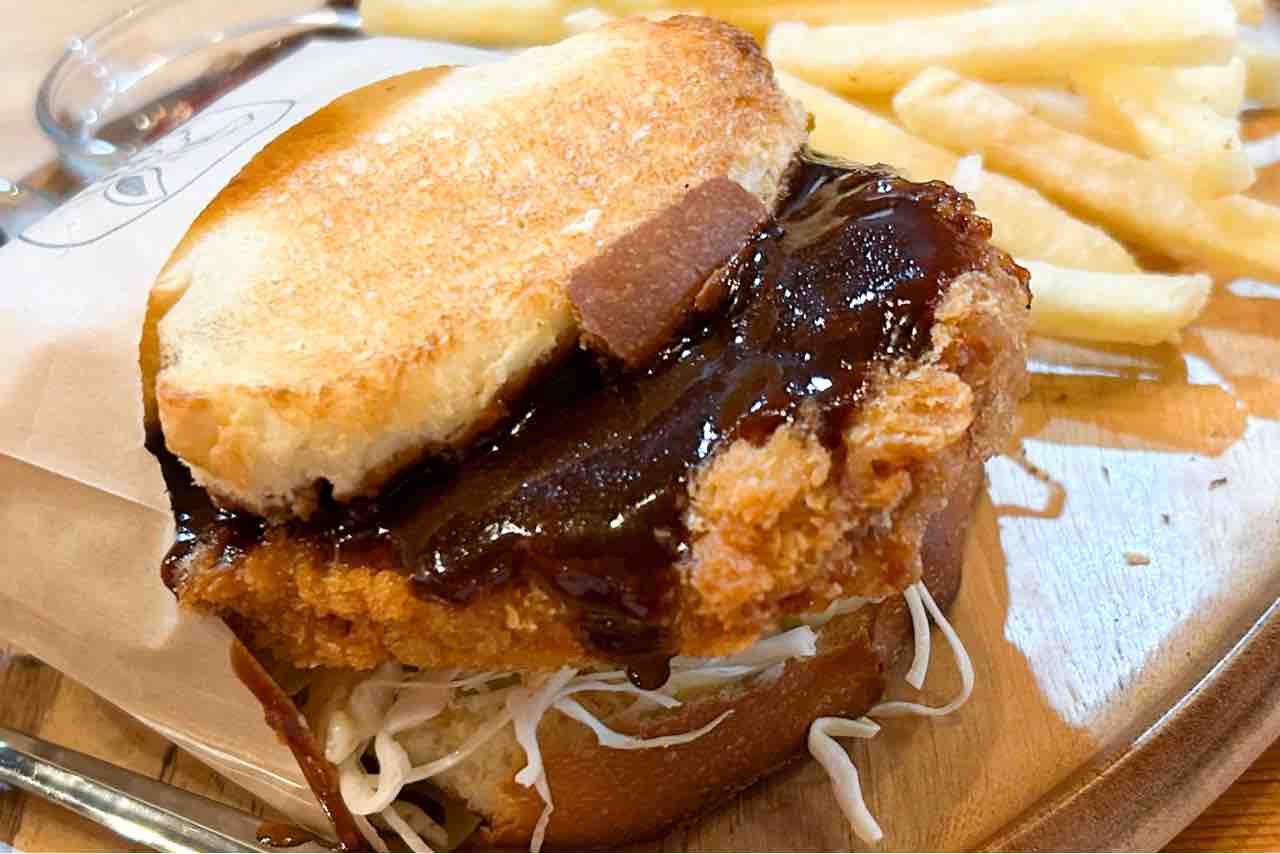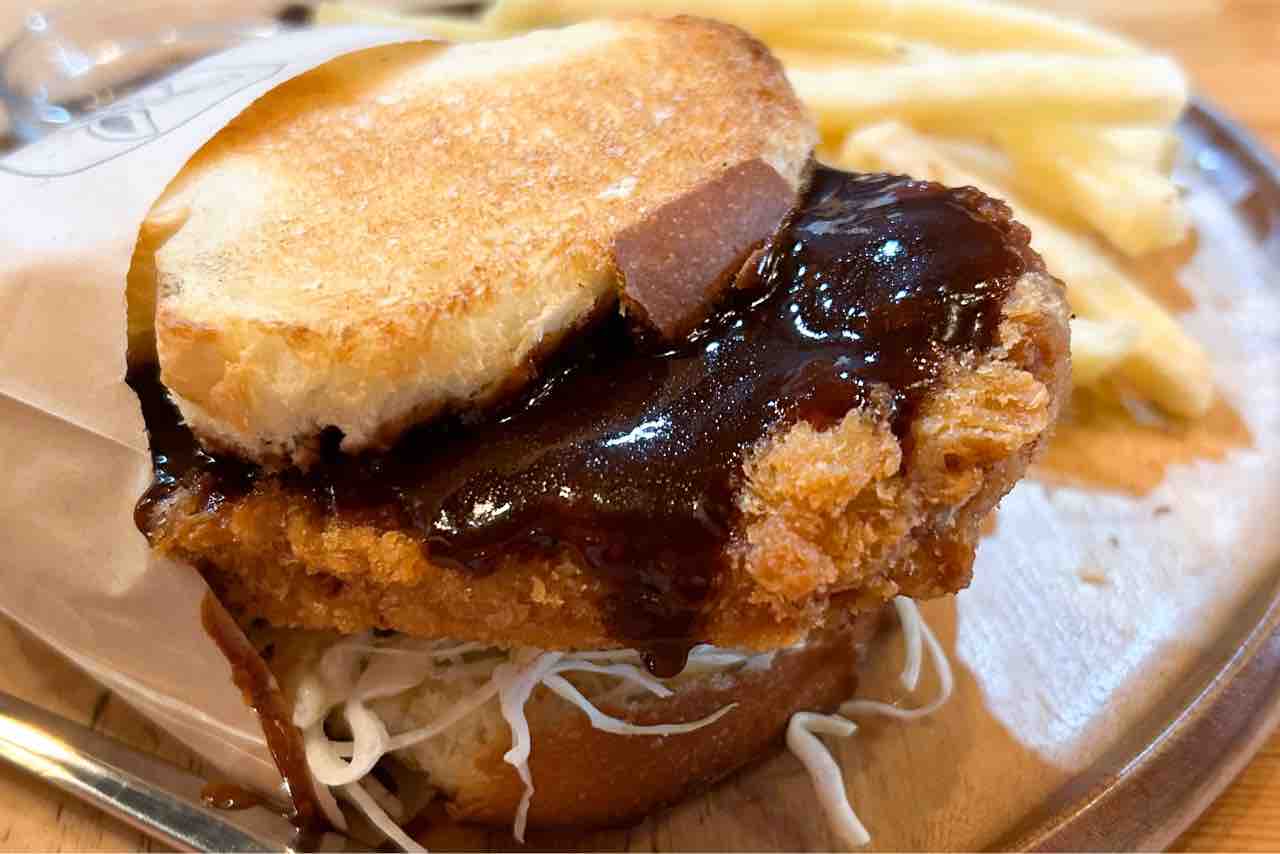 すごく分厚くて片手で持てないほど!揚げたてのカツは大きくて表面カリカリ!パンがふわふわ~。