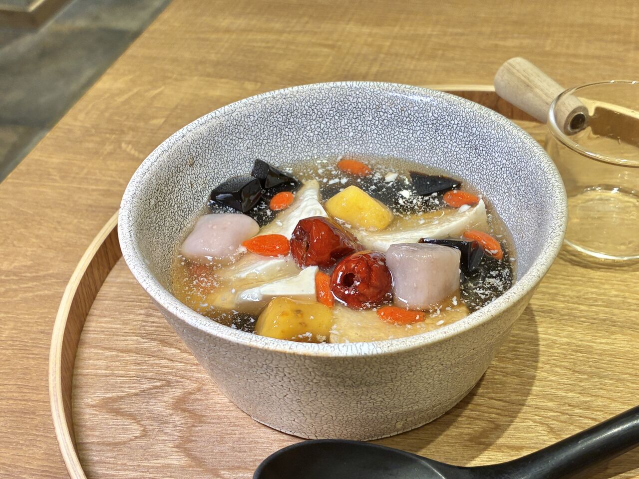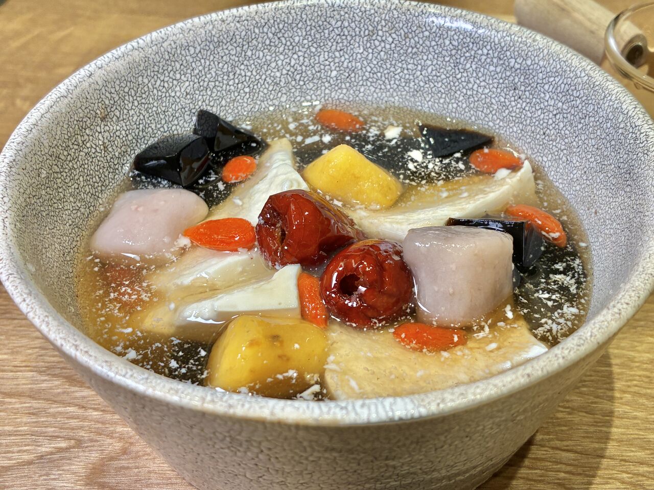 豆花のベースに芋圓というサツマイモやタロイモの団子に、カメゼリー、ナツメやクコの身などが入っています。シロップは自分で注ぐスタイル。