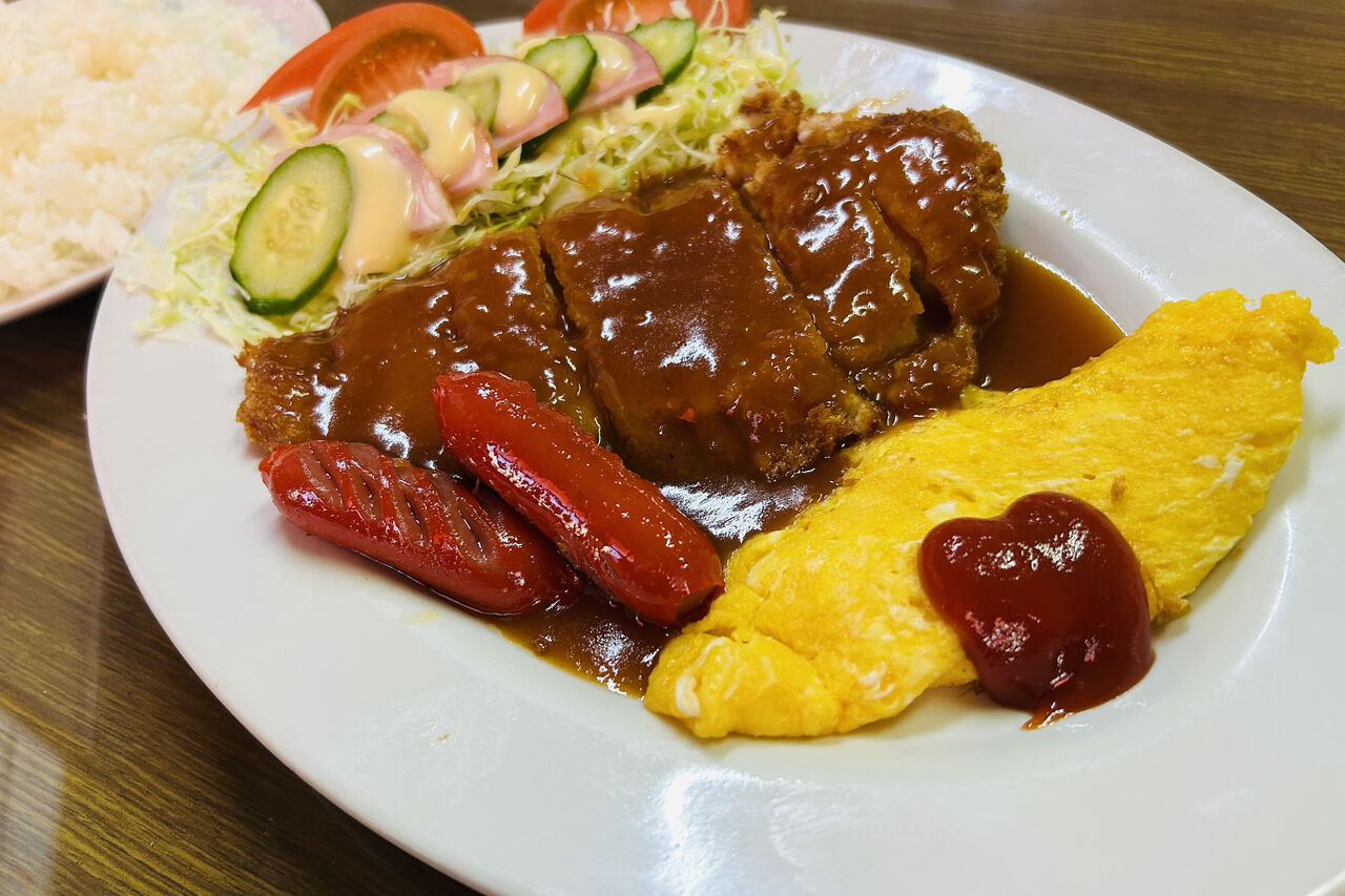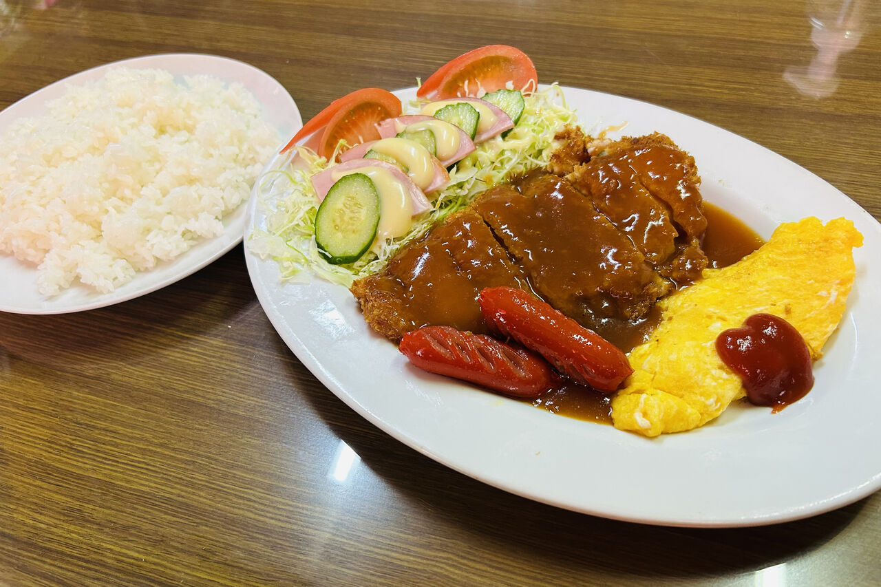 とんかつにオムレツ、サラダまでそろっていて、「これこれ」と言いたくなる一皿。