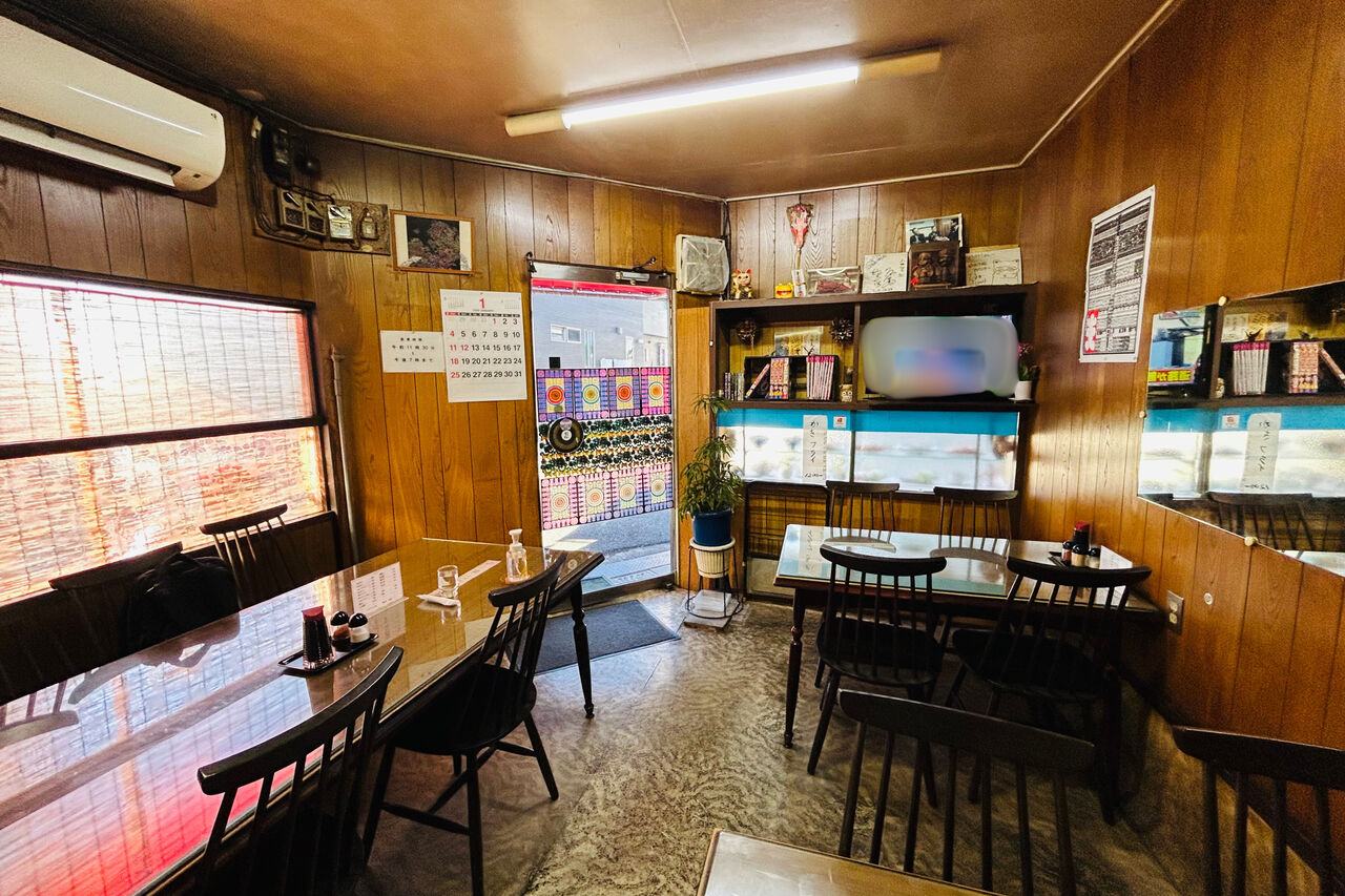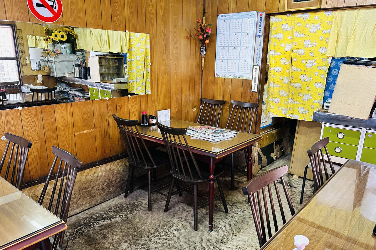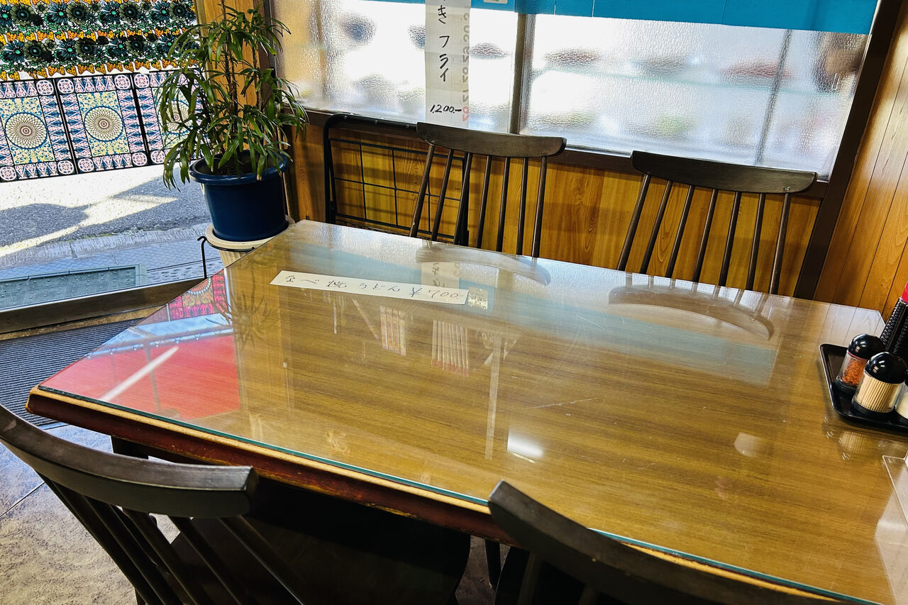 店内は4人掛けのテーブル席が2つと、6人掛けのテーブル席がひとつあります。