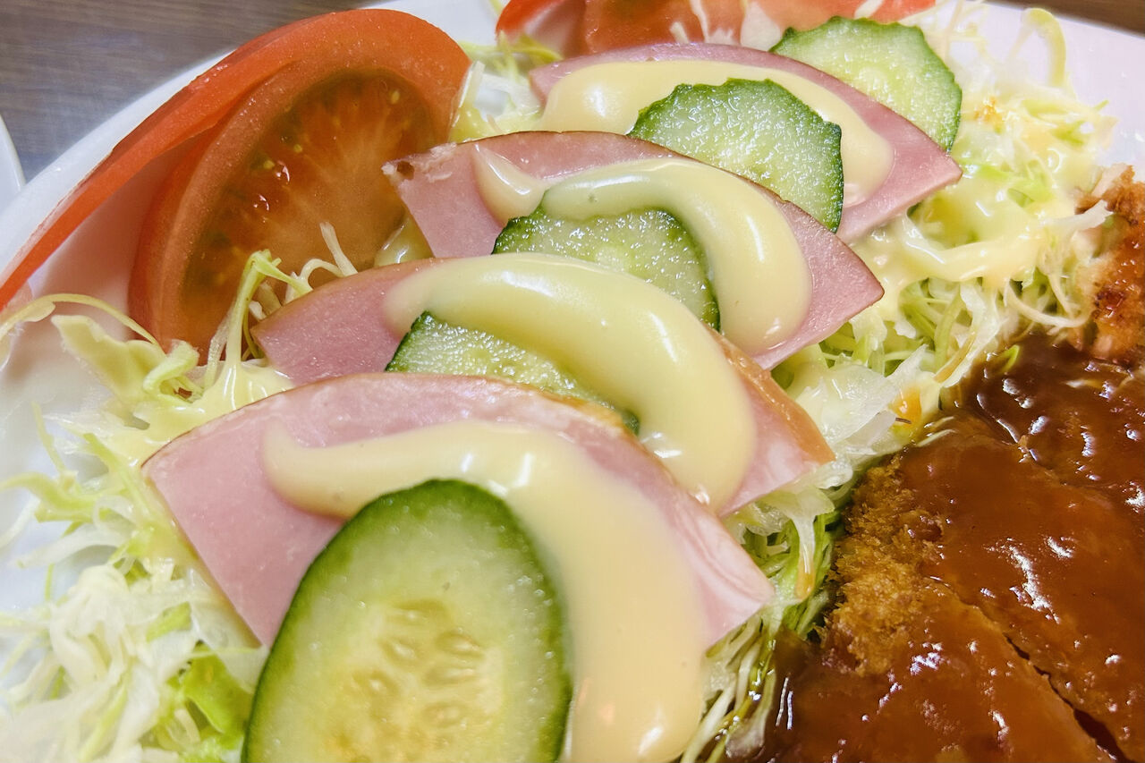 嬉しいたっぷり千切りキャベツにハムときゅうり、そこにかかったからしマヨがいい仕事。