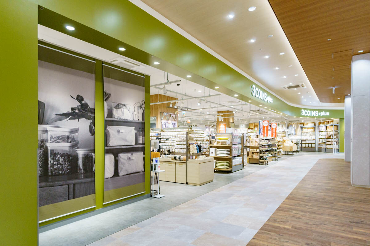 300円アイテム以外にも1000円や1500円アイテムも扱う、3COINSの大型店舗。