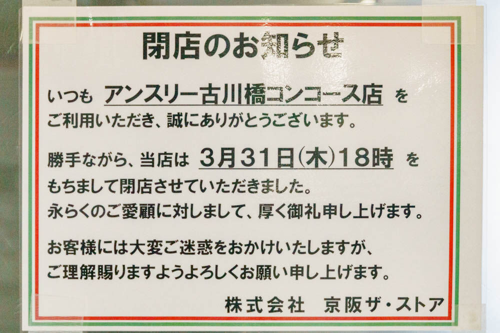 今回閉店した古川橋駅のアンスリーは今後のお知らせなどが掲示されておらずまだ正確には不明ですが、最近業態変更した京橋駅のアンスリーの場合は一時休業とアナウンスされていたようなので、今後は賃貸店舗になる可能性が高いかと思われます。