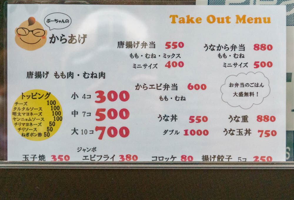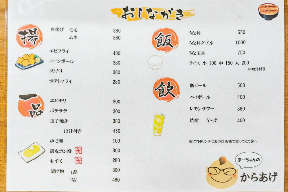 唐揚げや唐揚げ弁当をメインに、うな丼や卵焼きなどの一品もテイクアウトできるようです。