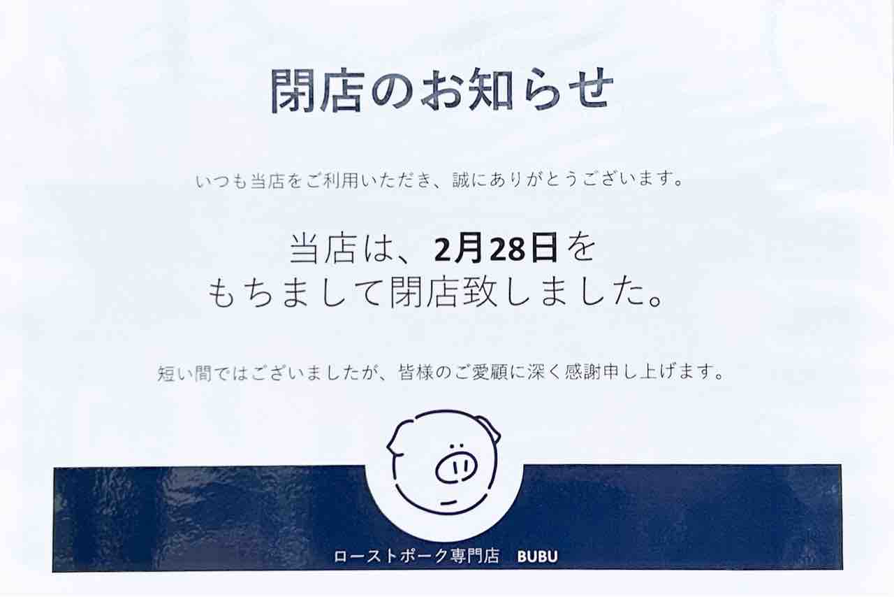 西郷通の「ローストポーク専門店 BUBU」が閉店しています。