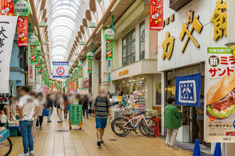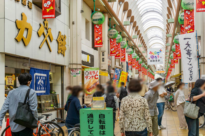 反対方向に行くと「ダイソー」などがあり、ずっと行くと千林大宮駅の方へでます。