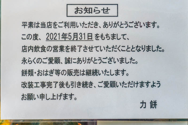 千林商店街の「力餅食堂」が店内飲食やめたみたい。和菓子のテイクアウト専門店に
