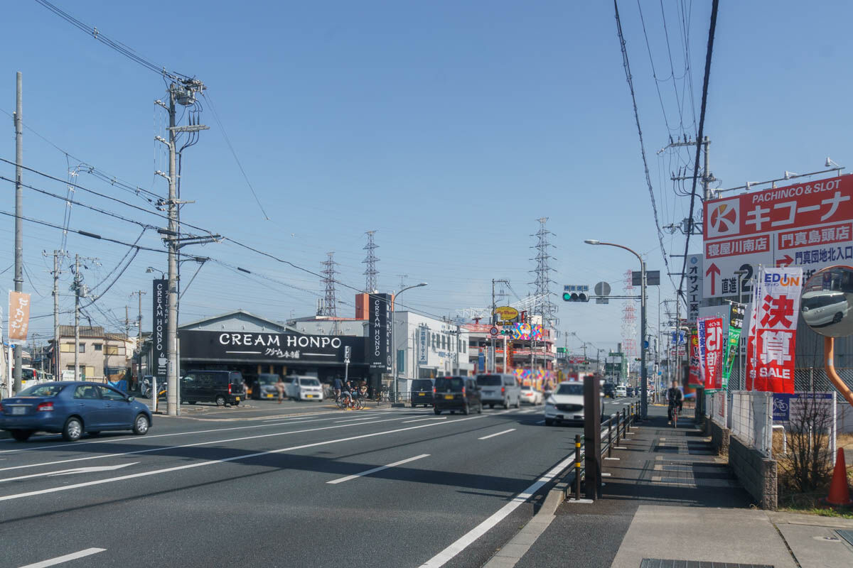 反対方向へ行くとジョリーパスタやキラメキノトリなどがあり、第二京阪道路を横切ります。