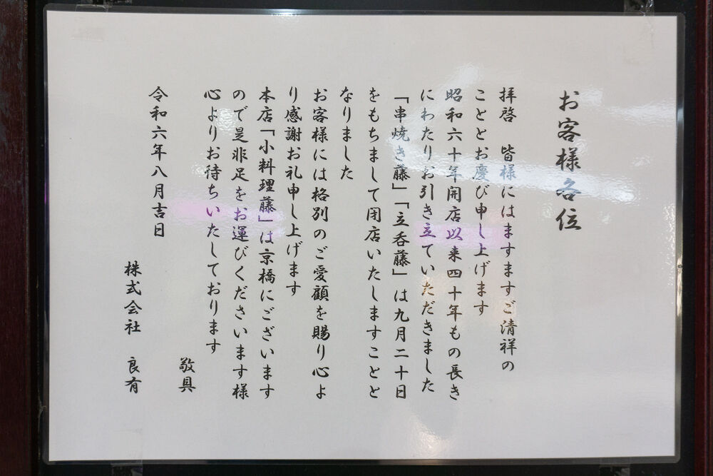 お知らせによると「串焼き 藤」「立呑み処 藤(立呑み 藤)」は1985年の開店から約40年間営業を続けてきましたが、9月20日の営業をもって閉店。