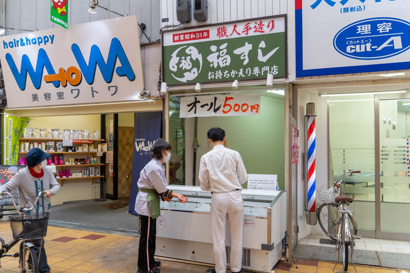 千林商店街につくってた寿司テイクアウト専門店「福すし」がオープンしてる。ALL500円