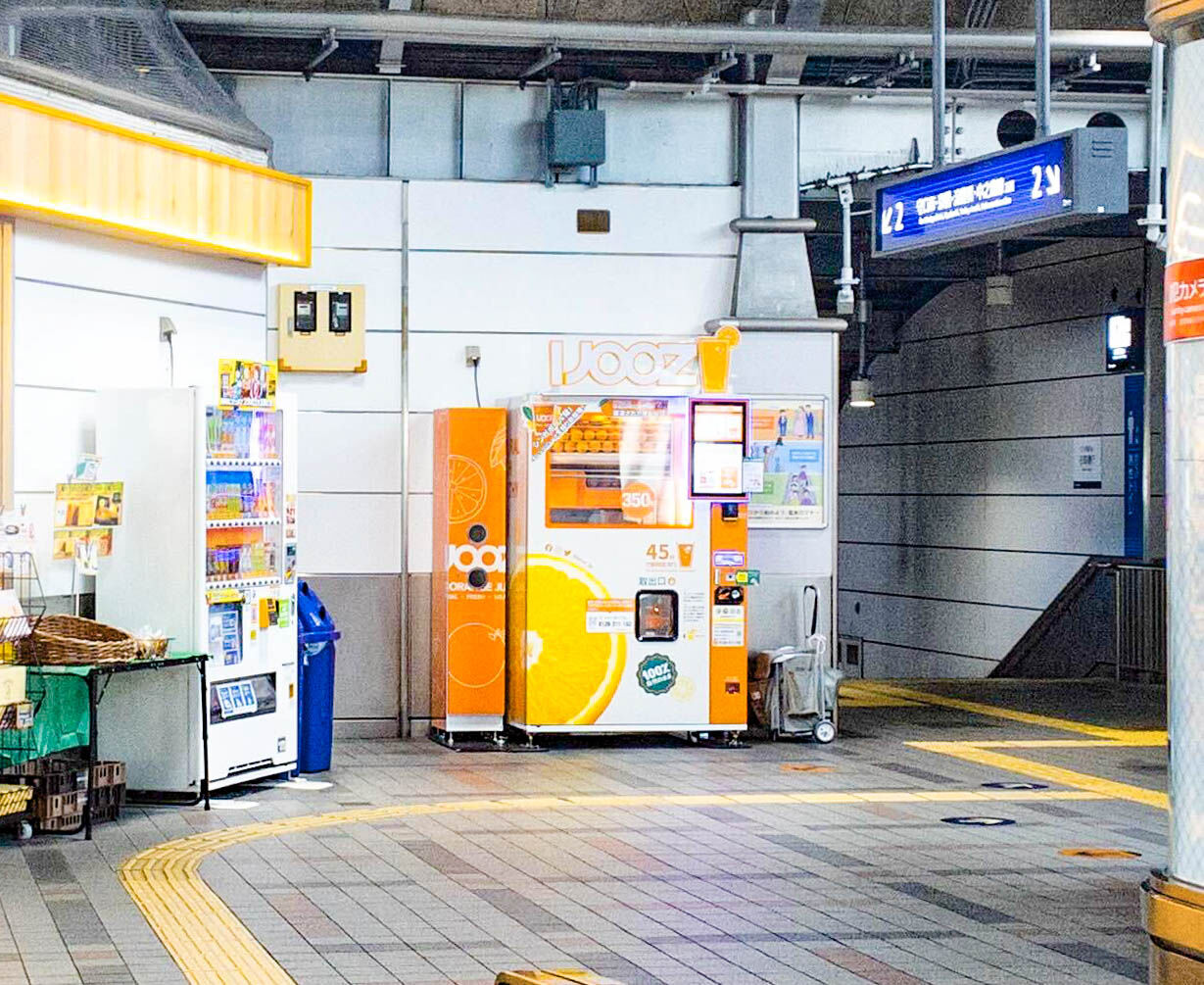 門真市駅構内に生絞りオレンジジュースの自販機「IJOOZ」が設置されています。