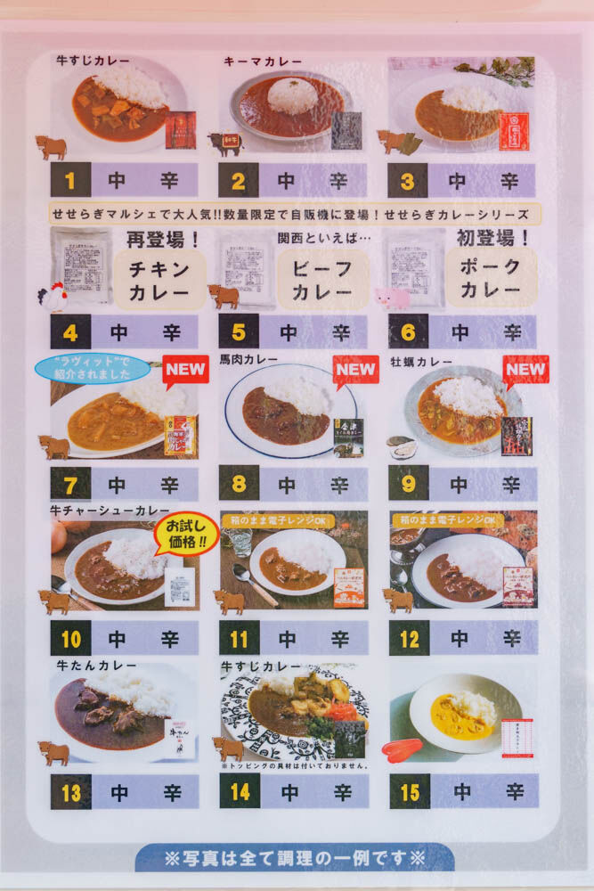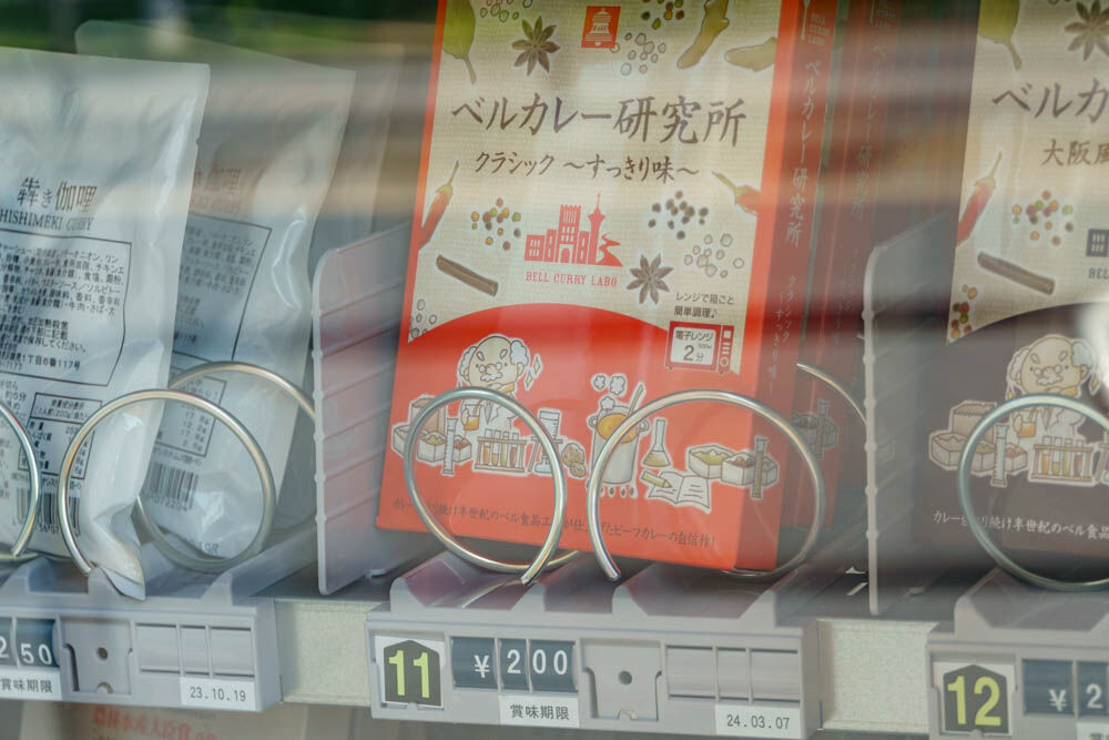 この自販機の真後ろにある食品会社「ベル食品工業」のカレーを取り扱っている自販機のようです。