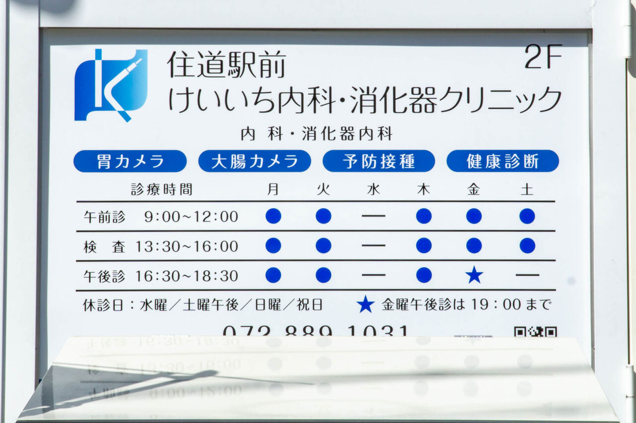 「住道駅前けいいち内科・消化器クリニック」の診療科目は内科・消化器内科。胃カメラや大腸カメラ、予防接種、健康診断などが受けられるクリニック。